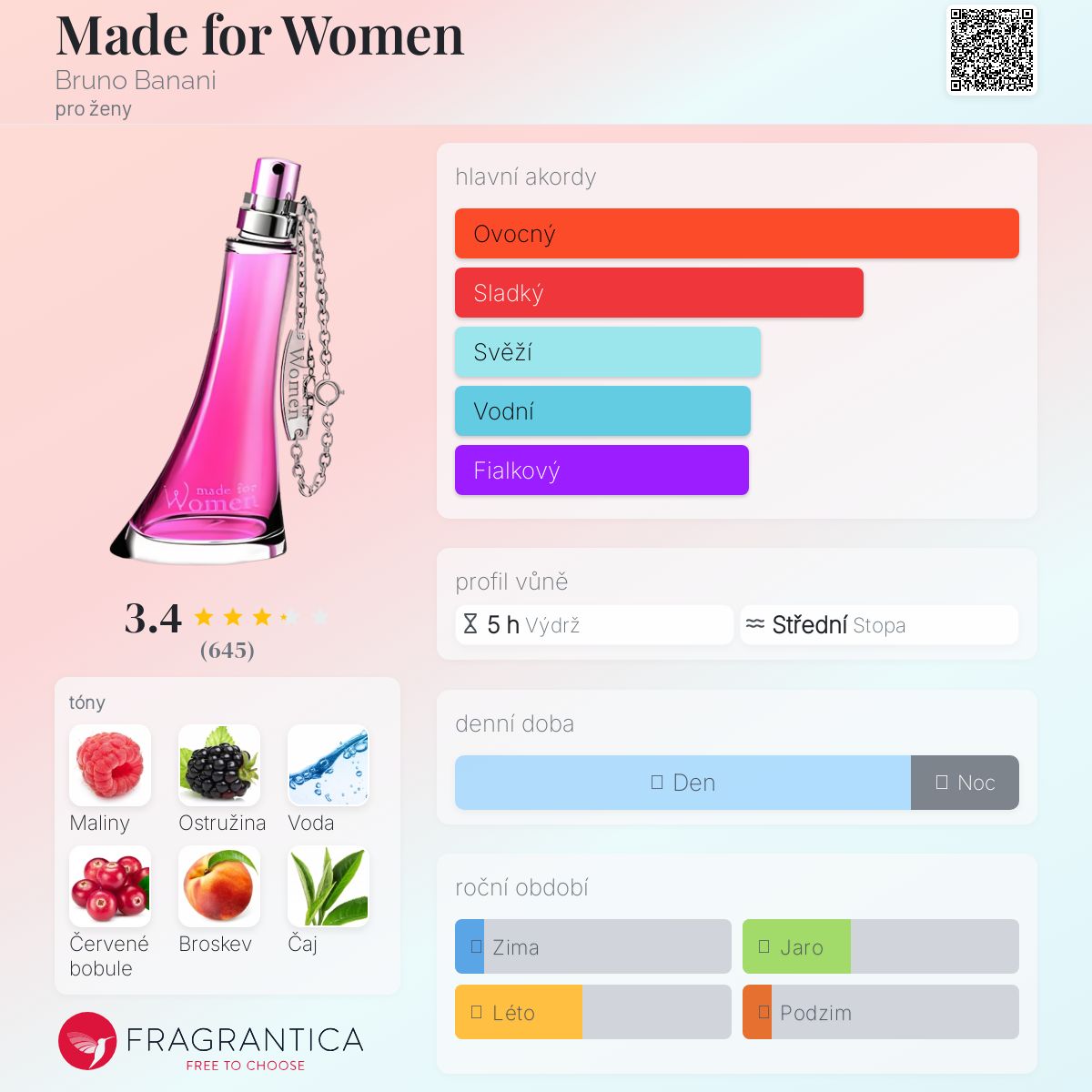Made for Women podle Bruno Banani je Floral Fruity vůně pro ženy. Made for Women byl/a uveden/a v roce 2011. Vrchní tóny jsou Ostružina a Čaj; střední tóny jsouČervené bobule, Broskev, Fialka a Kosatec ; základní tóny jsou Maliny, Vodní tóny a Jantar (ambra).