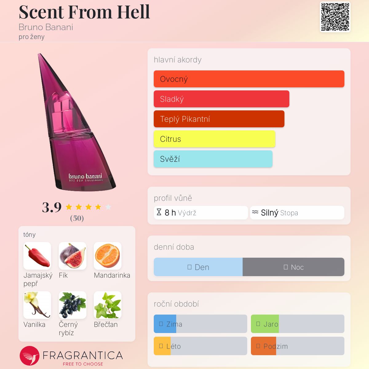 Scent From Hell podle Bruno Banani je Floral Fruity vůně pro ženy. Scent From Hell byl/a uveden/a v roce 2003. Vrchní tóny jsou Fík, Černý rybíz a Břečťan; střední tóny jsouPaprika, Mandarinka, Broskev a Květinové tóny ; základní tóny jsou Vanilka a Pižmo.