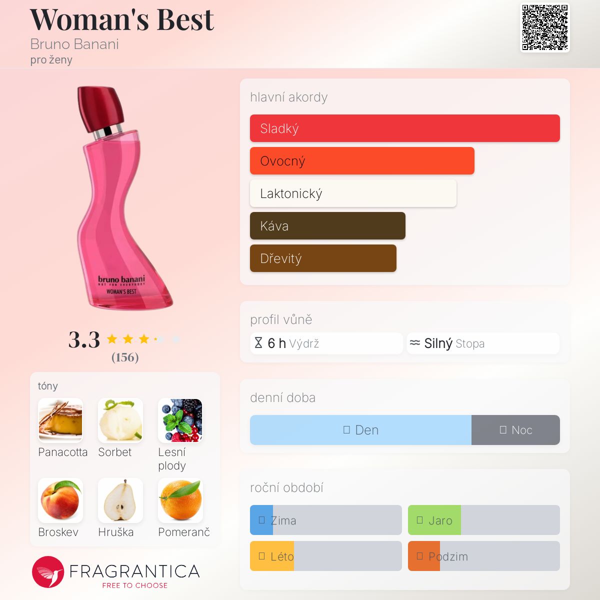 Woman's Best podle Bruno Banani je Floral Fruity vůně pro ženy. Woman's Best byl/a uveden/a v roce 2017. Vrchní tóny jsou Broskev, Pomeranč a Růžový grapefruit; střední tóny jsouSorbet, Hruška, Květ granátového jablka a Růže ; základní tóny jsou Panacotta, Lesní plody a Santalové dřevo.