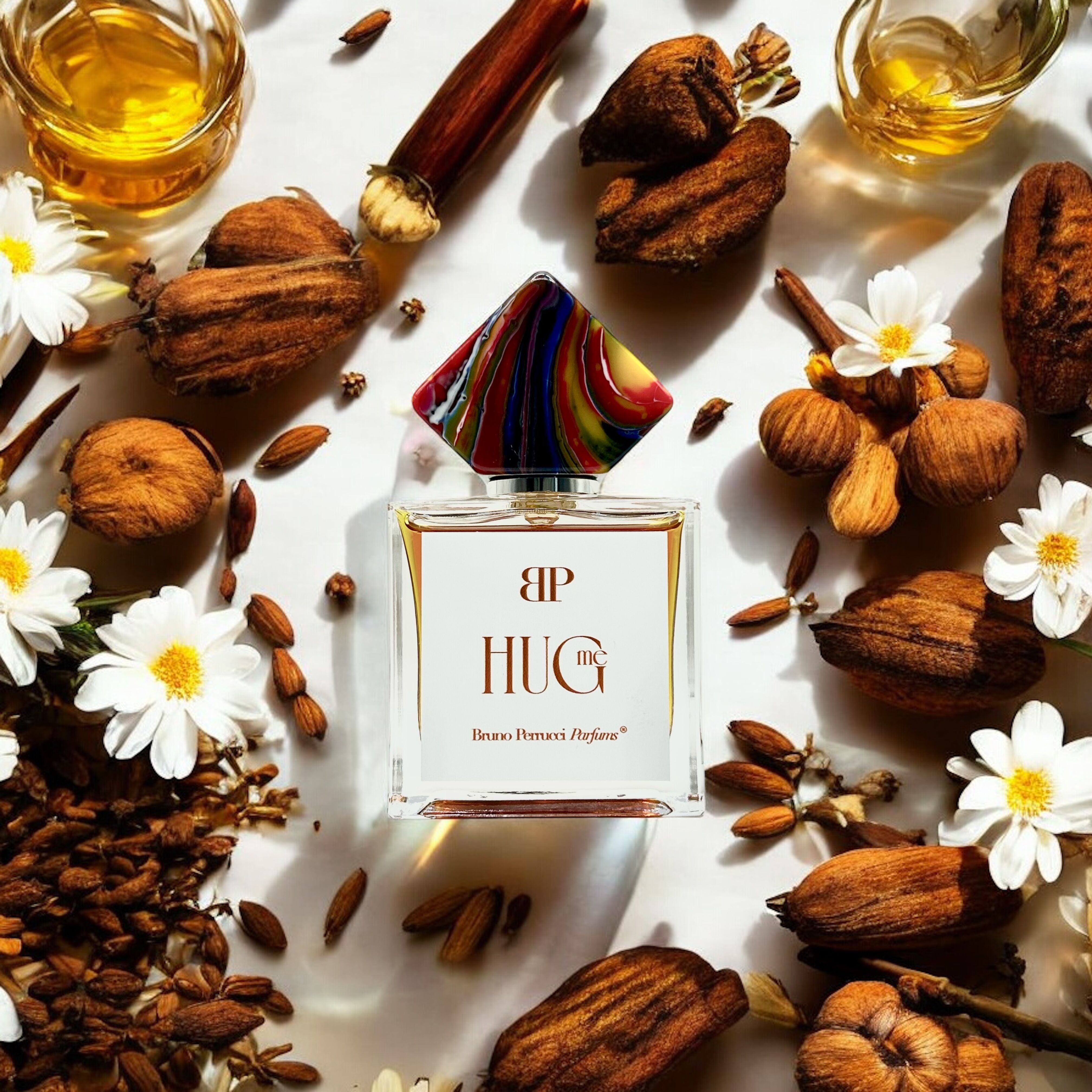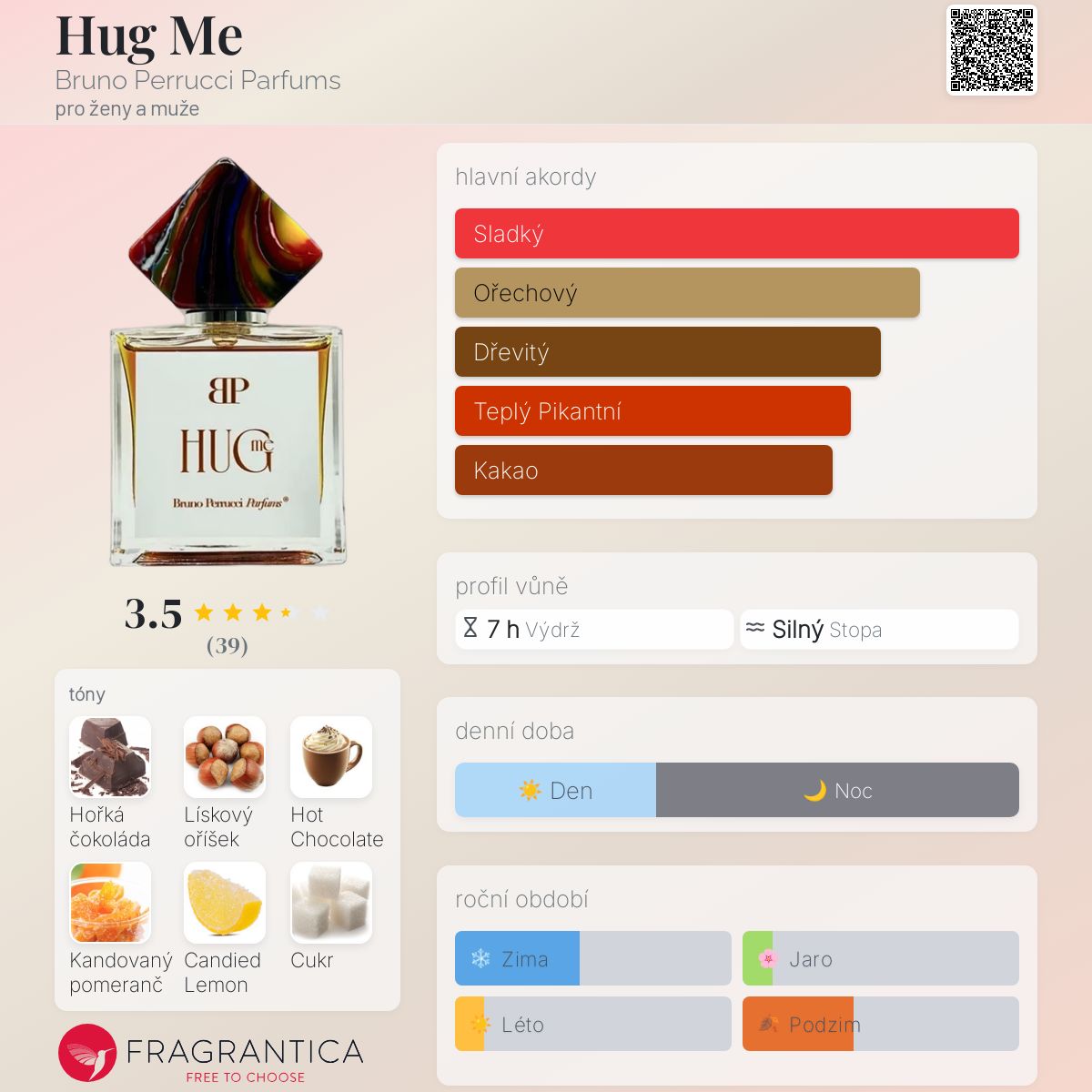 Hug Me podle Bruno Perrucci Parfums je Orientální Vanilla vůně pro ženy a muže. Toto je nová vůně. Hug Me byl/a uveden/a v roce 2025. "Nosem" za touto vůní je Bruno Perrucci. Vrchní tóny jsou Kandovaný pomeranč, Kandovaný citron , Rum a Fík; střední tóny jsouHořká čokoláda, Lískový oříšek, Hot Chocolate, Cukrová třtina a Vlašský ořech ; základní tóny jsou Kakao, Wine must a Vanilka.