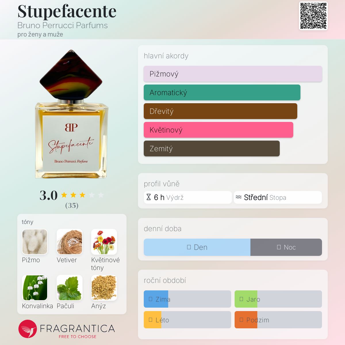 Stupefacente podle Bruno Perrucci Parfums je vůně pro ženy a muže. Toto je nová vůně. Stupefacente byl/a uveden/a v roce 2024. "Nosem" za touto vůní je Bruno Perrucci. Vrchní tóny jsou Květiny, Anýz, Pomeranč a Koňak; střední tóny jsouKonvalinka, Květiny, Levandule, Pelargónie, Růže a Zelený čaj ; základní tóny jsou Šedé pižmo, Vetiver, Pačuli, Jantar (ambra), Myrha a Vanilka.