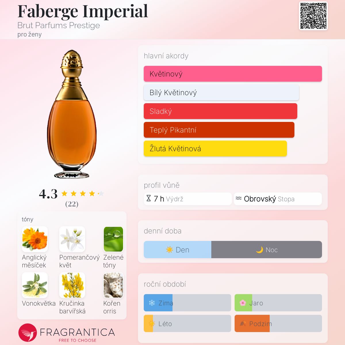 Faberge Imperial podle Brut Parfums Prestige je Floral Woody Musk vůně pro ženy. Faberge Imperial byl/a uveden/a v roce 1996. Vrchní tóny jsou Měsíček, Květ afrického pomeranče, Zelené tóny, Ylang-Ylang a Bergamot; střední tóny jsouVonokvětka, Kručinka barvířská, Růže, Fialkový list, Karafiát, Jasmín a Hřebíček ; základní tóny jsou Kořen orris, Pižmo, Santalové dřevo a Pačuli.