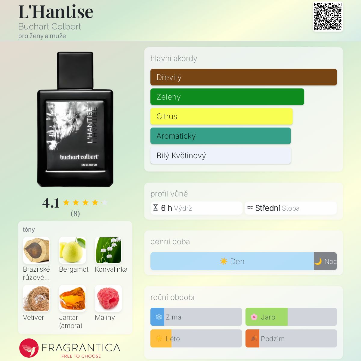 L'Hantise podle Buchart Colbert je Floral vůně pro ženy a muže. Toto je nová vůně. L'Hantise byl/a uveden/a v roce 2024. "Nosem" za touto vůní je Sean Colbert. Vrchní tóny jsou Brazilské růžové dřevo, Bergamot a Červený rybíz; střední tóny jsouKonvalinka, Maliny a Bylinné tóny ; základní tóny jsou Vetiver, Jantar (ambra) a Pačuli.