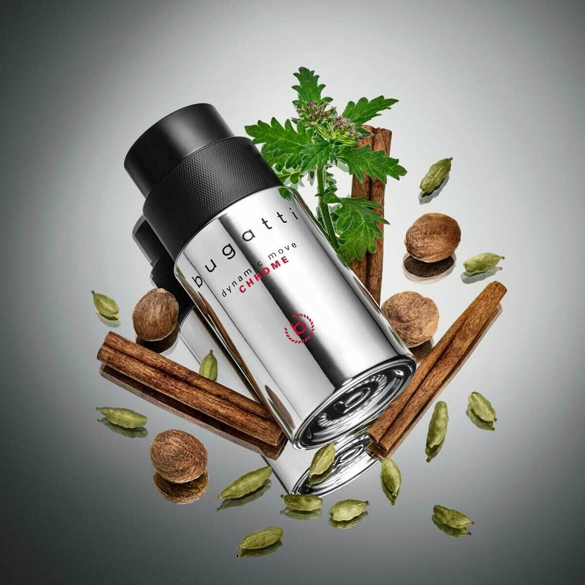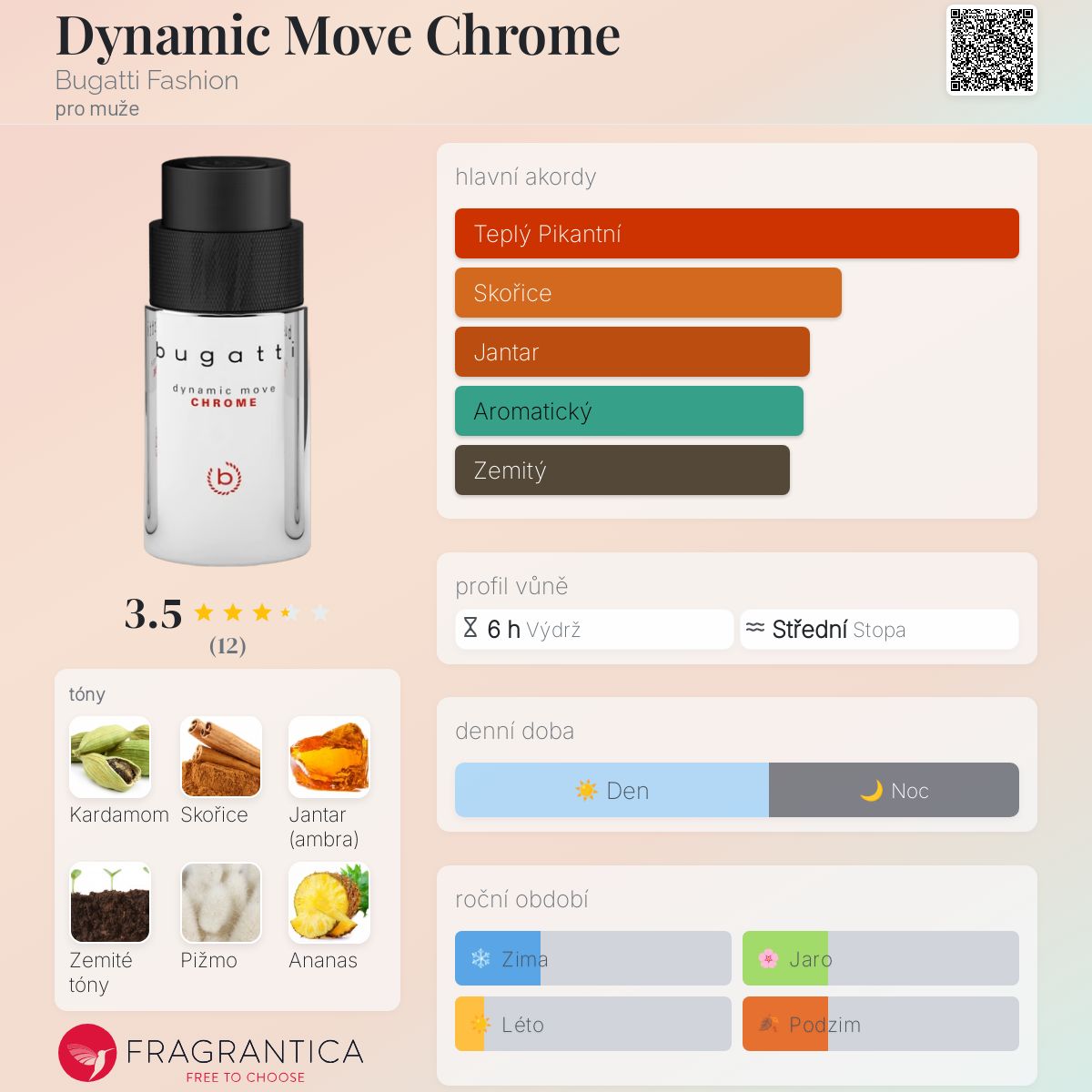 Dynamic Move Chrome podle Bugatti Fashion je Aromatic Spicy vůně pro muže. Toto je nová vůně. Dynamic Move Chrome byl/a uveden/a v roce 2024. "Nosem" za touto vůní je Simone Lo Bue. Vrchní tóny jsou Zemité tóny, Ananas a Bobkový list; střední tóny jsouKardamom, Skořice a Muškátový oříšek ; základní tóny jsou Jantar (ambra), Pižmo a Pačuli.
