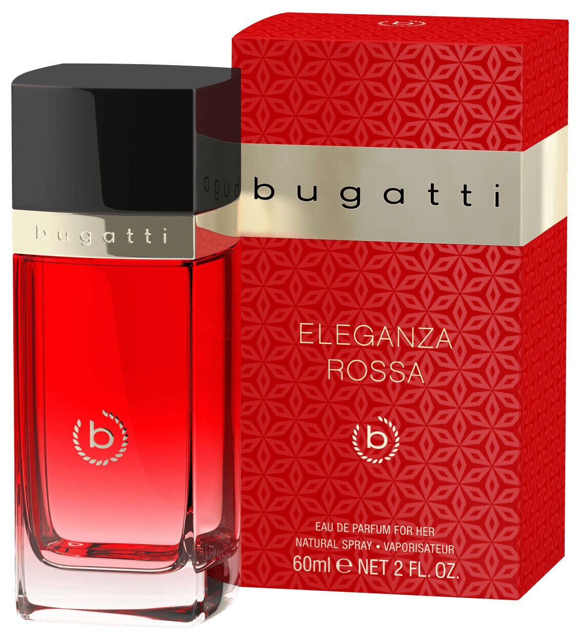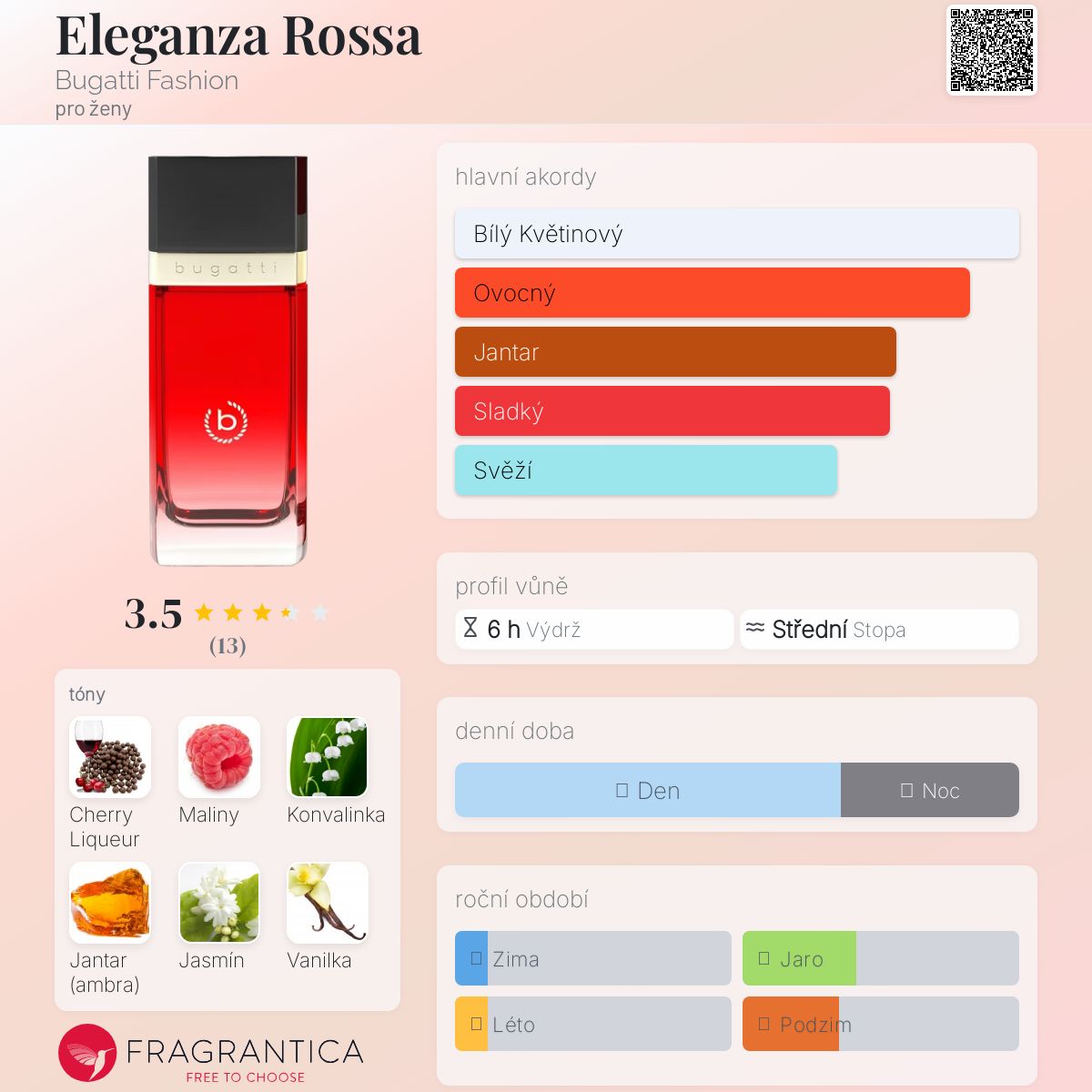 Eleganza Rossa podle Bugatti Fashion je Floral Fruity Gourmand vůně pro ženy. Eleganza Rossa byl/a uveden/a v roce 2023. Vrchní tóny jsou Třešňový likér, Maliny a Bílá broskev; střední tóny jsouKonvalinka, Jasmín Sambac a Kosatec bledý ; základní tóny jsou Jantar (ambra), Vanilka a Pačuli.