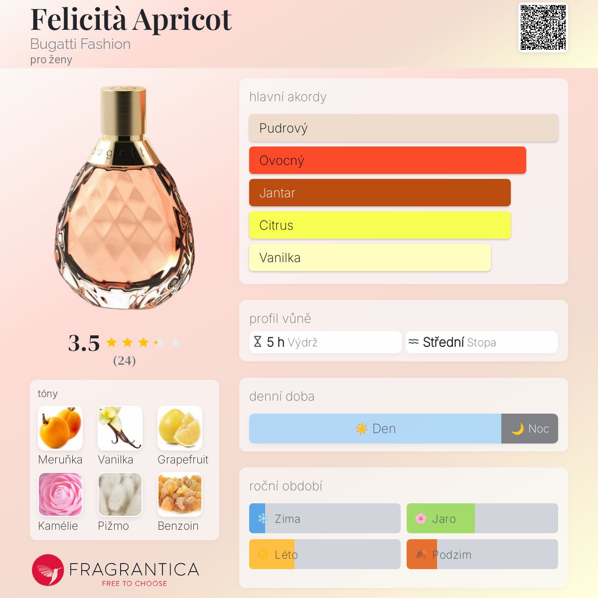 Felicità Apricot podle Bugatti Fashion je Orientální Floral vůně pro ženy. Toto je nová vůně. Felicità Apricot byl/a uveden/a v roce 2024. Vrchní tóny jsou Meruňka, Růžový grapefruit, Sladký pomeranč a Liči; střední tóny jsouKamélie, Ibišek a Sazaník ; základní tóny jsou Vanilka, Bílé pižmo, Benzoin, Jantar (ambra) a Santalové dřevo.
