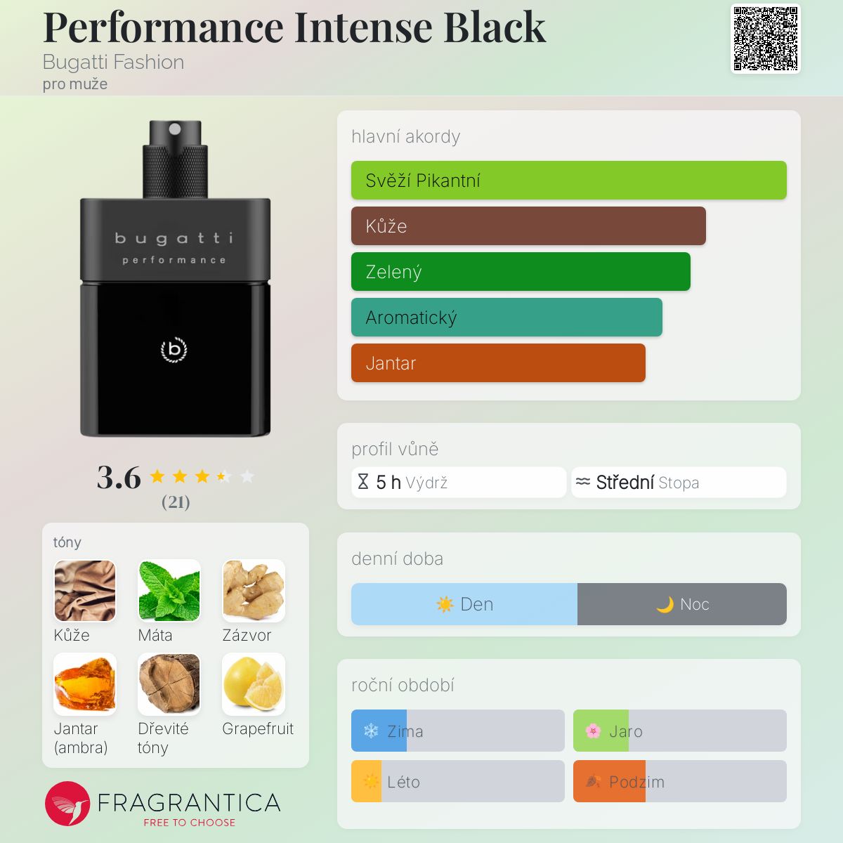 Performance Intense Black podle Bugatti Fashion je Woody Aromatic vůně pro muže. Performance Intense Black byl/a uveden/a v roce 2023. Vrchní tóny jsou Zázvor, Grapefruit, Mučenka a Černý pepř; střední tóny jsouMáta a Kořeněné tóny ; základní tóny jsou Kůže, Jantar (ambra), Vzácné dřevo a Bílé pižmo.