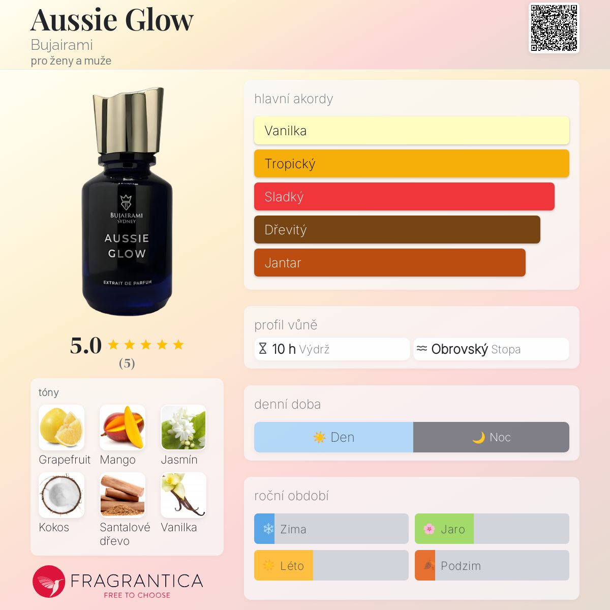 Aussie Glow podle Bujairami je vůně pro ženy a muže. Toto je nová vůně. Aussie Glow byl/a uveden/a v roce 2025. "Nosem" za touto vůní je Adam Bujairami. Vrchní tóny jsou Grapefruit a Mango; střední tóny jsouJasmín a Kokos ; základní tóny jsou Santalové dřevo, Vanilka a Jantar (ambra).
