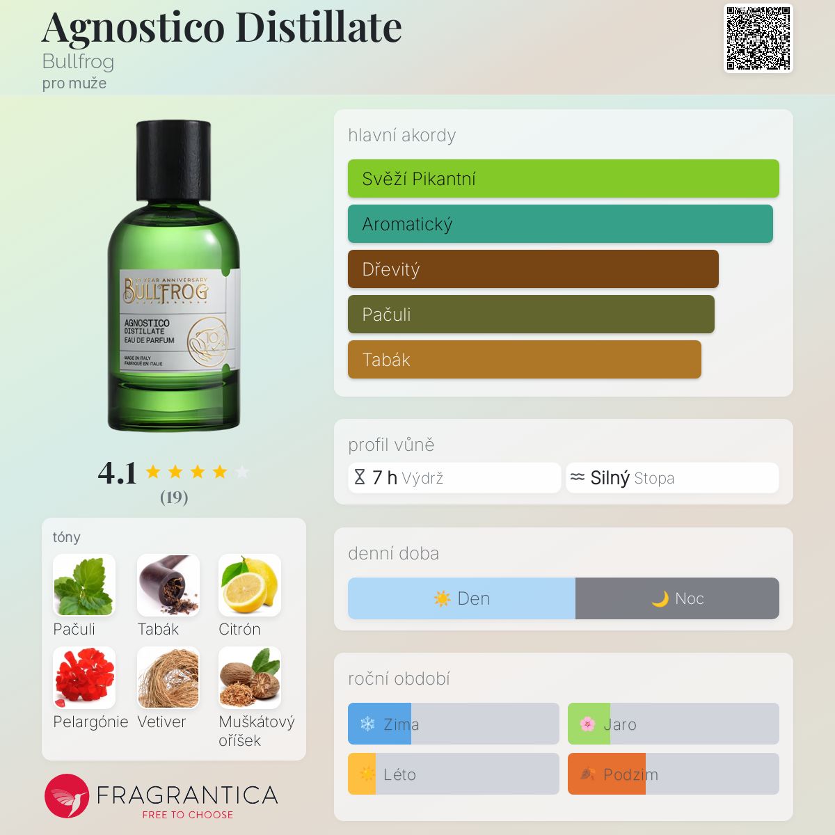 Agnostico Distillate podle Bullfrog je vůně pro muže. Agnostico Distillate byl/a uveden/a v roce 2023. "Nosem" za touto vůní je Sofia Bardelli. Vrchní tóny jsou Citrón, Muškátový oříšek a Růžový pepř; střední tóny jsouPelargónie, Lékořice a Anýz ; základní tóny jsou Pačuli, Tabák a Vetiver.
