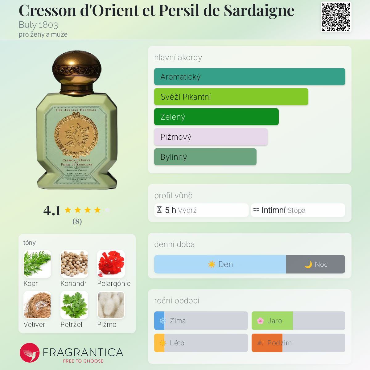 Cresson d'Orient et Persil de Sardaigne podle Buly 1803 je Aromatic Green vůně pro ženy a muže. Cresson d'Orient et Persil de Sardaigne byl/a uveden/a v roce 2023.