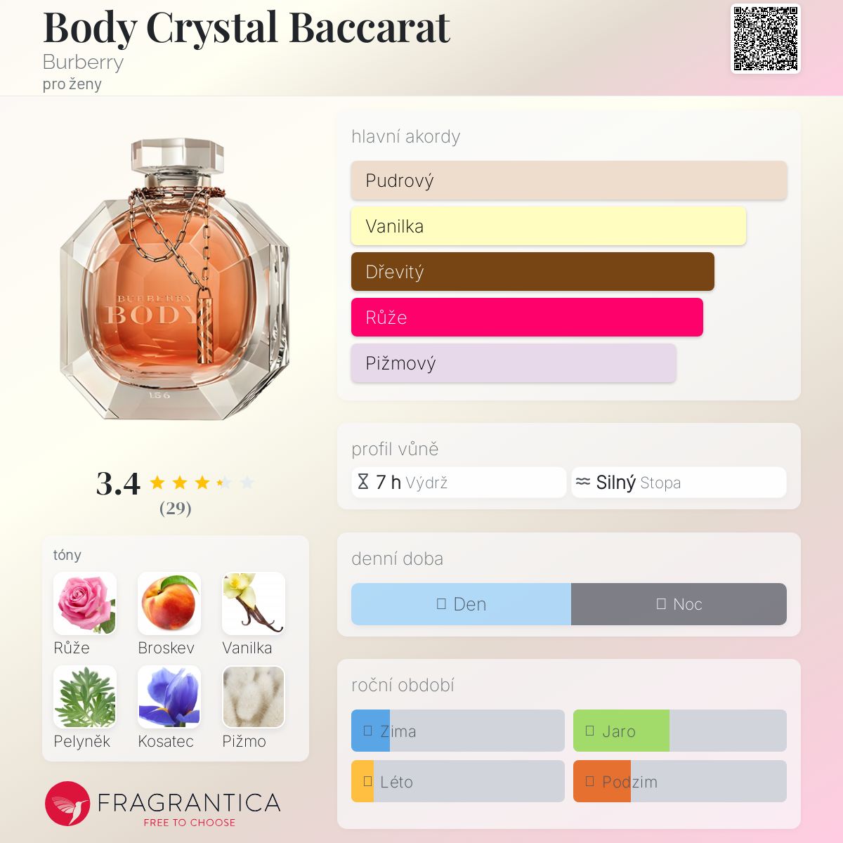 Body Crystal Baccarat podle Burberry je Chypre Fruity vůně pro ženy. Body Crystal Baccarat byl/a uveden/a v roce 2012. "Nosem" za touto vůní je Michel Almairac. Vrchní tóny jsou Broskev a Pelyněk; střední tóny jsouRůže, Kosatec a Santalové dřevo ; základní tóny jsou Vanilka, Pižmo, Fazole tonka a Kašmírové dřevo.