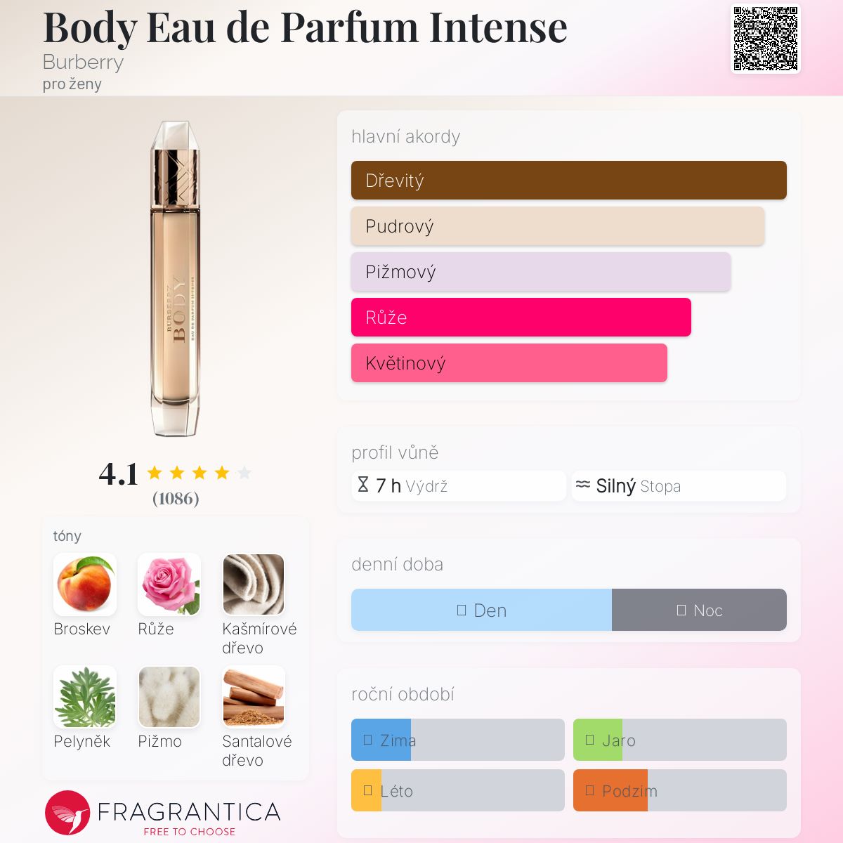 Body Eau de Parfum Intense podle Burberry je Chypre Fruity vůně pro ženy. Body Eau de Parfum Intense byl/a uveden/a v roce 2011. "Nosem" za touto vůní je Michel Almairac. Vrchní tóny jsou Broskev, Pelyněk a Frézie; střední tóny jsouRůže, Santalové dřevo a Kosatec ; základní tóny jsou Kašmírové dřevo, Pižmo, Vanilka a Jantar (ambra).