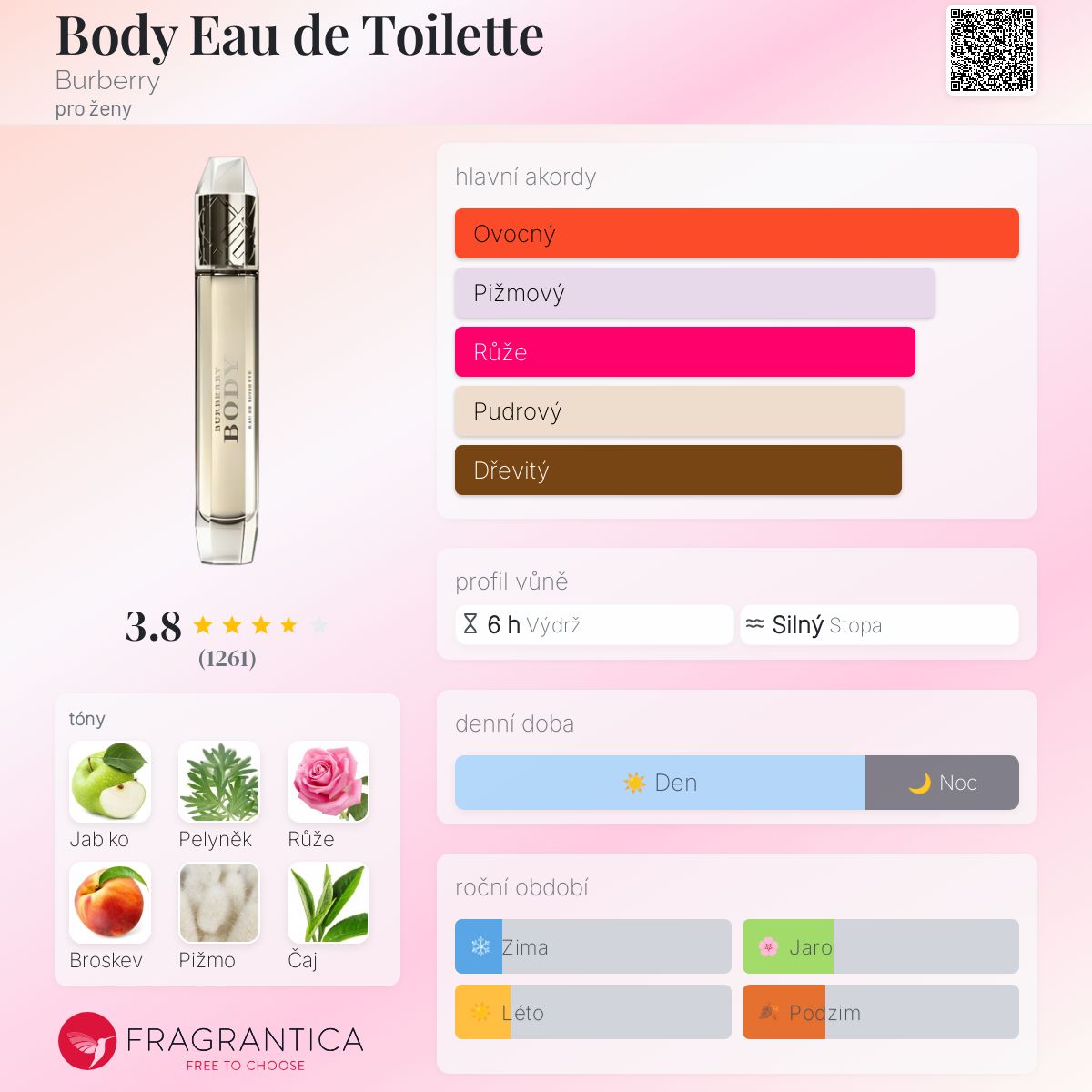 Body Eau de Toilette podle Burberry je Chypre Fruity vůně pro ženy. Body Eau de Toilette byl/a uveden/a v roce 2012. "Nosem" za touto vůní je Michel Almairac. Vrchní tóny jsou Zelené jablko, Pelyněk a Broskev; střední tóny jsouRůže, Čaj a Santalové dřevo ; základní tóny jsou Pižmo, Kašmírové dřevo, Vanilka a Jantar (ambra).