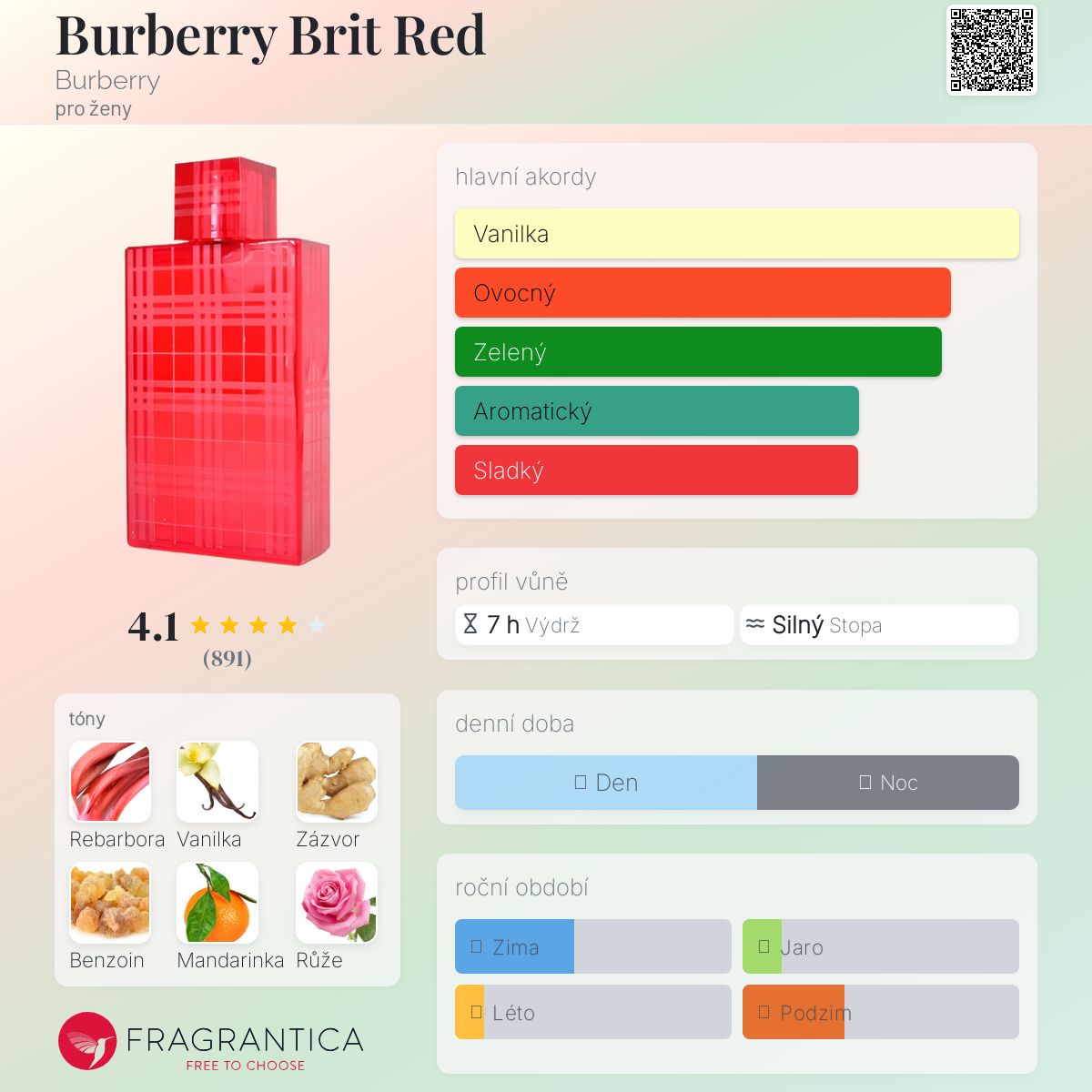 Burberry Brit Red podle Burberry je Orientální Floral vůně pro ženy. Burberry Brit Red byl/a uveden/a v roce 2004. "Nosem" za touto vůní je Natalie Gracia-Cetto. Vrchní tóny jsou Rebarbora, Mandarinka a Jasmín; střední tóny jsouZázvor, Růže a Pačuli ; základní tóny jsou Vanilkový lusk, Benzoin a Santalové dřevo. Tento parfém je vítězem oceněníFiFi Award Fragrance Of The Year Women`s Nouveau Niche 2005 .