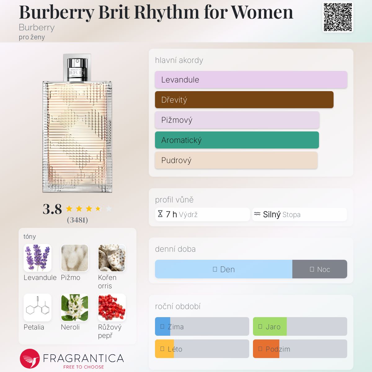 Burberry Brit Rhythm for Women podle Burberry je Floral Woody Musk vůně pro ženy. Burberry Brit Rhythm for Women byl/a uveden/a v roce 2014. Burberry Brit Rhythm for Women byl/a vytvořen/a Natalie Gracia-Cetto a Antoine Maisondieu. Vrchní tóny jsou Levandule, Neroli, Růžový pepř a Aldehydy; střední tóny jsouOrris, Petalia, Pomerančový květ a List ostružinovníku ; základní tóny jsou Pižmo, Dřevité tóny, Vetiver, Cedr a Kumarin.