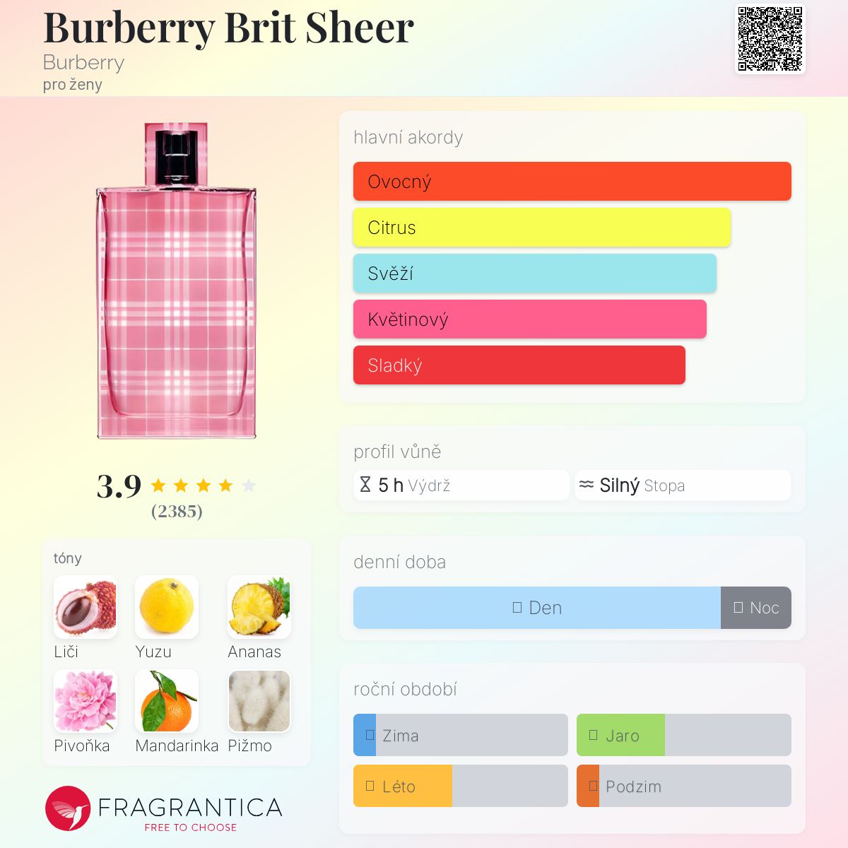 Burberry Brit Sheer podle Burberry je Floral Fruity vůně pro ženy. Burberry Brit Sheer byl/a uveden/a v roce 2007. "Nosem" za touto vůní je Emilie Coppermann. Vrchní tóny jsou Liči, Yuzu, Ananasový list a Mandarinka; střední tóny jsouPivoňka, Broskvový květ a Hruška ; základní tóny jsou Bílé pižmo a Bílé dřevo.