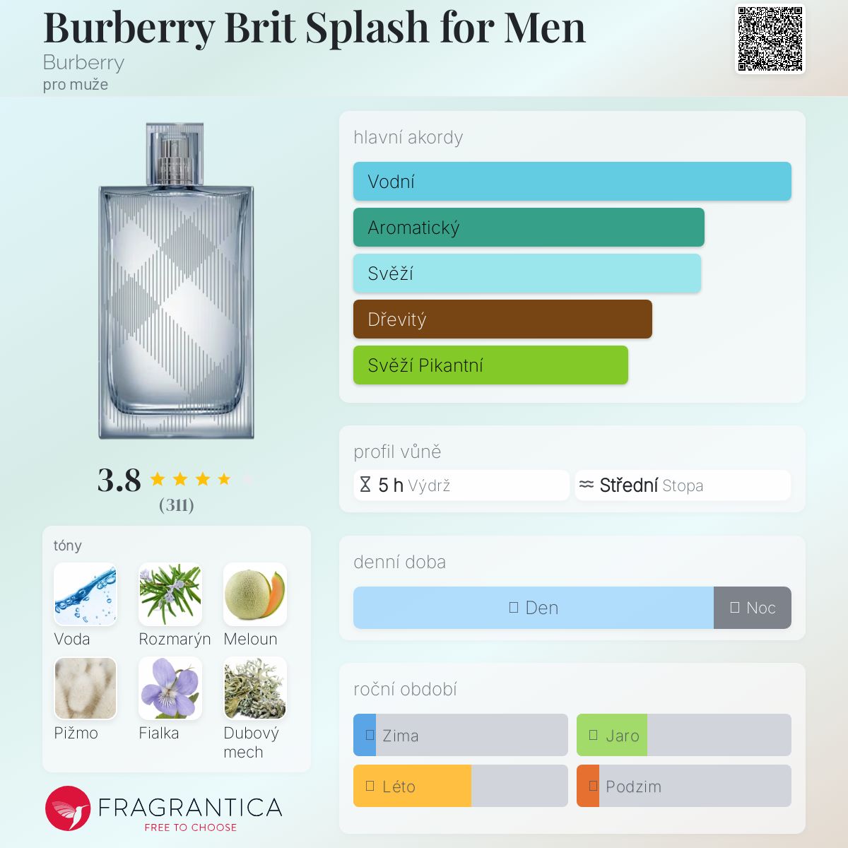 Burberry Brit Splash for Men podle Burberry je Woody Aquatic vůně pro muže. Burberry Brit Splash for Men byl/a uveden/a v roce 2015. Vrchní tóny jsou Rozmarýn, Meloun a Galbanum; střední tóny jsouVodnaté tóny, Fialka a Brambořík ; základní tóny jsou Pižmo, Mech a Vetiver.