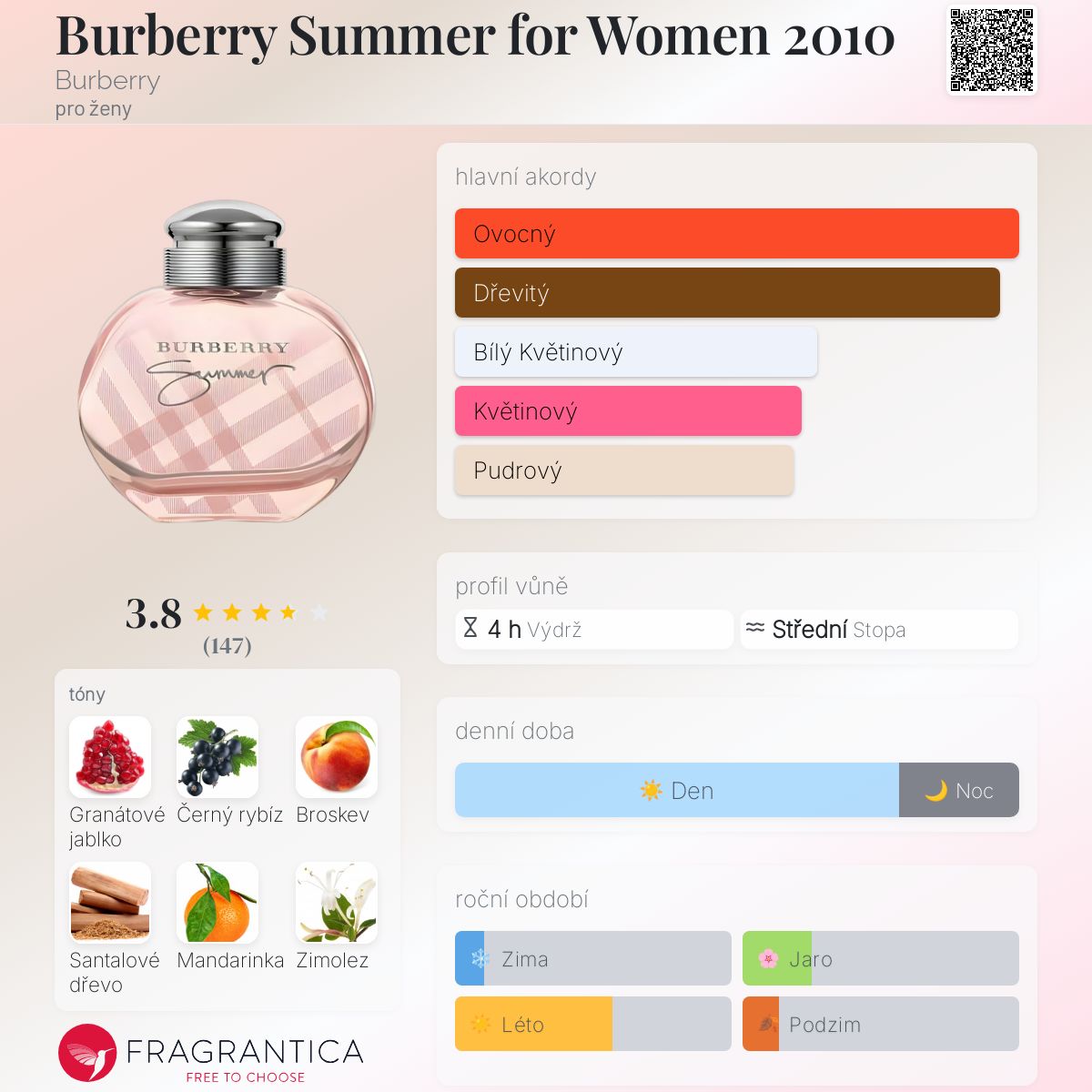Burberry Summer for Women 2010 podle Burberry je Floral Green vůně pro ženy. Burberry Summer for Women 2010 byl/a uveden/a v roce 2010. Vrchní tóny jsou Granátové jablko, Černý rybíz, Broskev a Mandarinka; střední tóny jsouZimolez, Frézie, Tinktura z růže a Lilie ; základní tóny jsou Santalové dřevo, Pižmo a Virginský cedr.