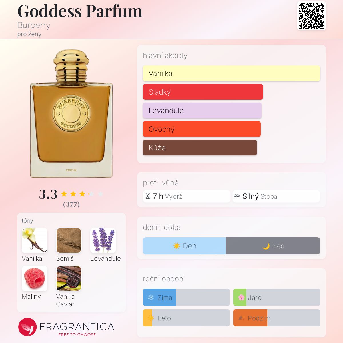 Goddess Parfum podle Burberry je Orientální Vanilla vůně pro ženy. Toto je nová vůně. Goddess Parfum byl/a uveden/a v roce 2025. "Nosem" za touto vůní je Amandine Clerc-Marie. Vrchní tóny jsou Levandule a Maliny; střední tóny jsouVanilka, Vanilka a Kaviár z vanilky ; základní tón je Semiš.