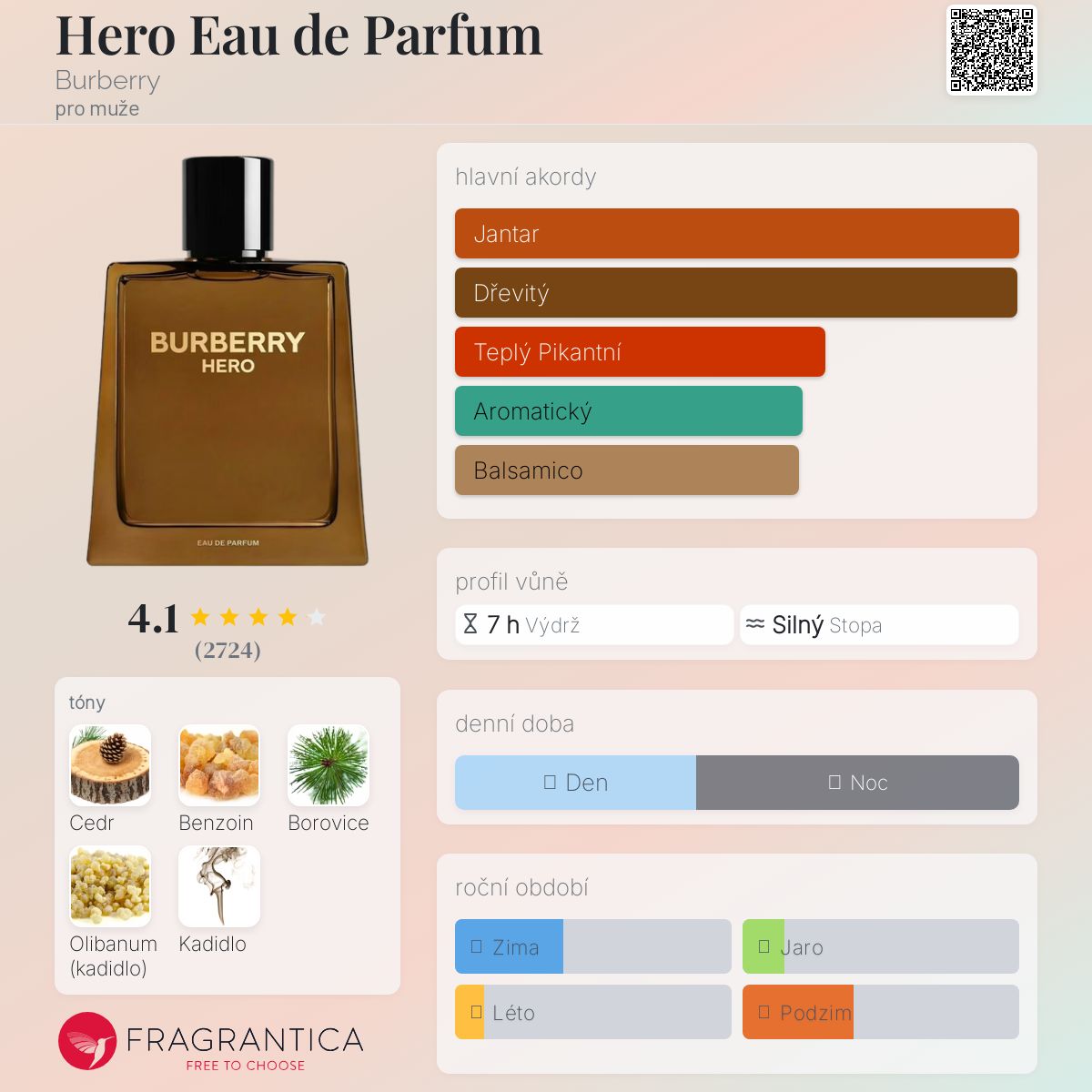 Hero Eau de Parfum podle Burberry je Woody Spicy vůně pro muže. Toto je nová vůně. Hero Eau de Parfum byl/a uveden/a v roce 2022. "Nosem" za touto vůní je Aurélien Guichard. Vrchní tóny jsou Jehličí borovice a Olibanum; střední tóny jsouBenzoin a Kadidlo ; základní tóny jsou Atlasový cedr, Himalájský cedr a Virginský cedr.