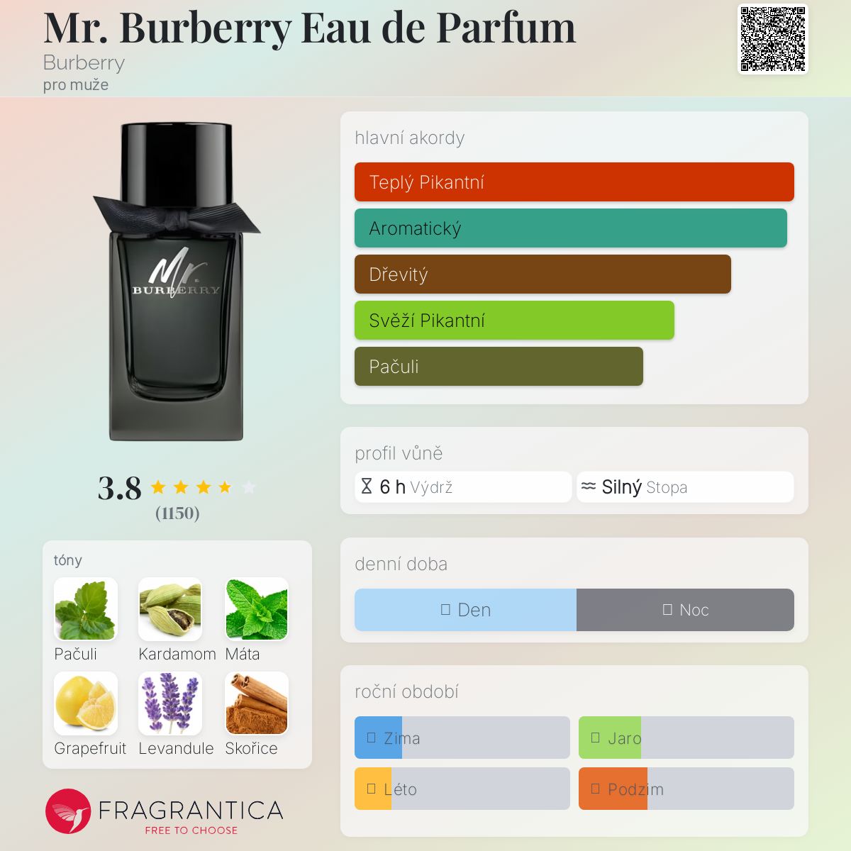 Mr. Burberry Eau de Parfum podle Burberry je Woody Spicy vůně pro muže. Mr. Burberry Eau de Parfum byl/a uveden/a v roce 2017. "Nosem" za touto vůní je Francis Kurkdjian. Vrchní tóny jsou Kardamom, Máta, Grapefruit a Estragon; střední tóny jsouLevandule, Muškátový oříšek a Cedr ; základní tóny jsou Pačuli, Skořice, Jantar (ambra), Benzoin, Vetiver a Santalové dřevo.