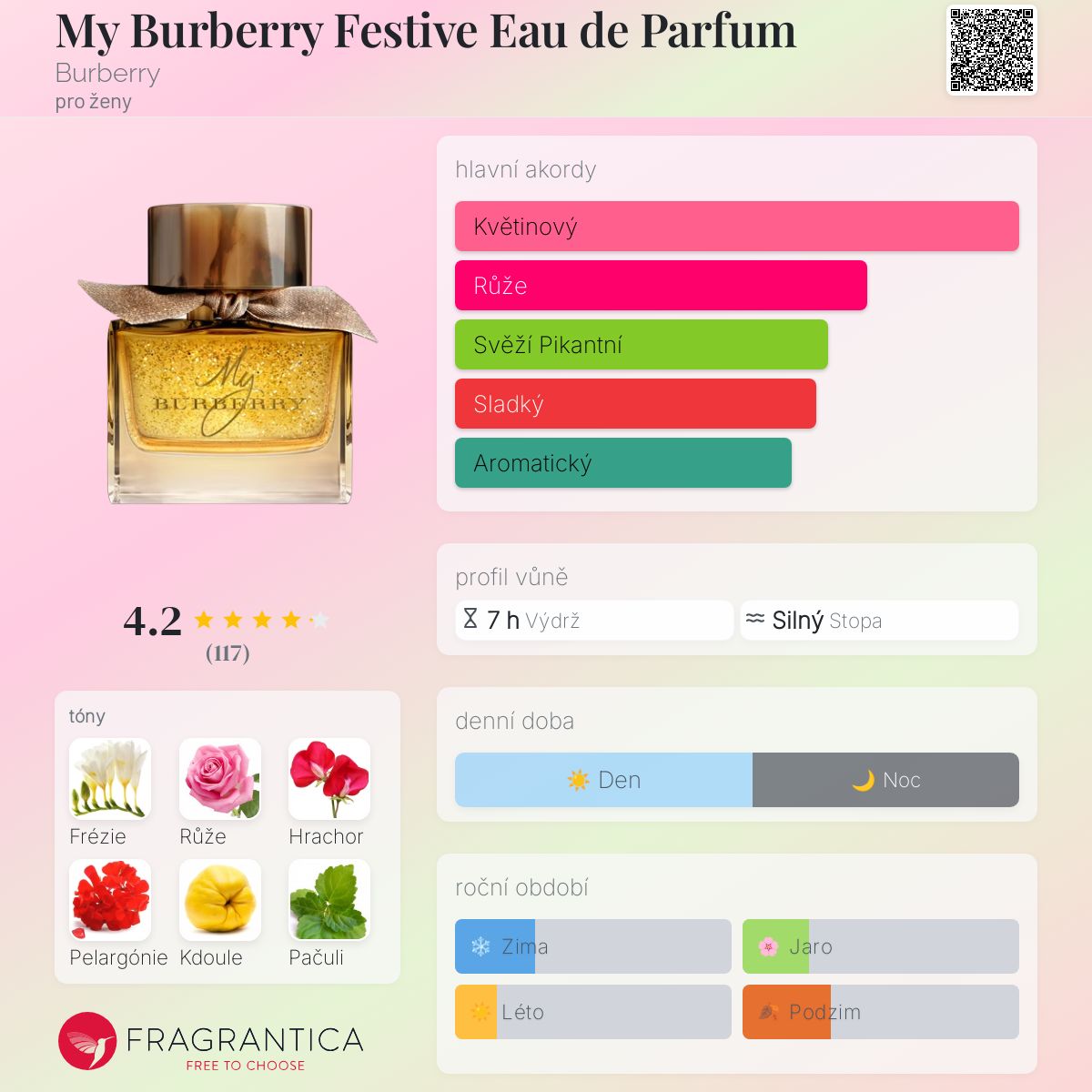 My Burberry Festive Eau de Parfum podle Burberry je Floral vůně pro ženy. My Burberry Festive Eau de Parfum byl/a uveden/a v roce 2015. Vrchní tóny jsou Hrachor, Bourbonské geránium a Bergamot; střední tóny jsouFrézie a Kdoule ; základní tóny jsou Damašská růže, Růže a Pačuli.