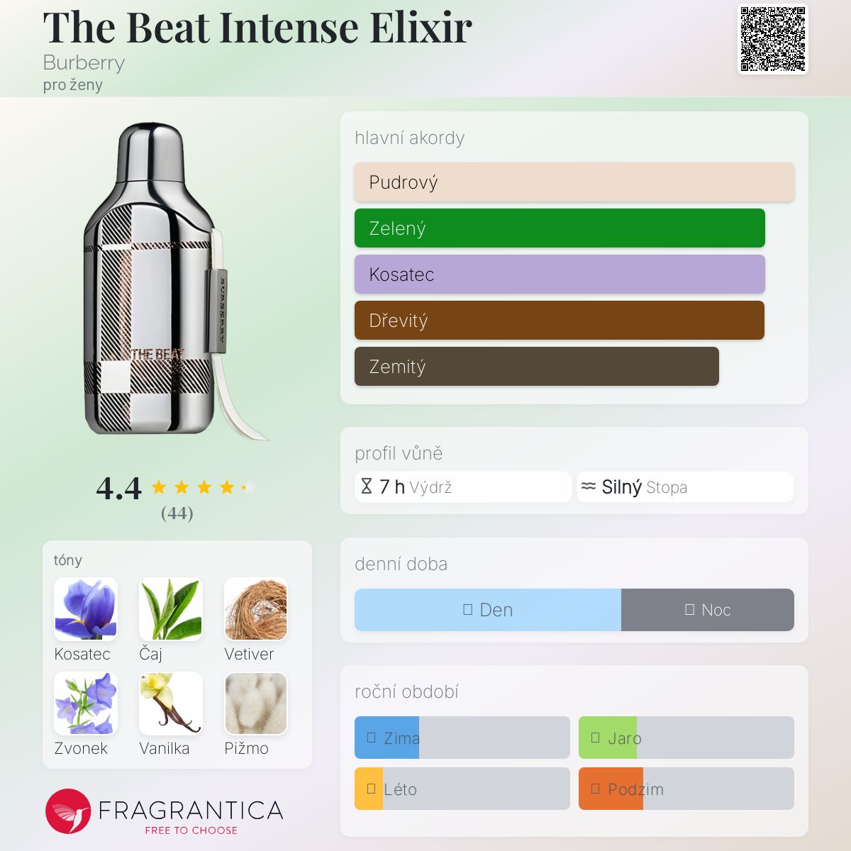 The Beat Intense Elixir podle Burberry je Floral Woody Musk vůně pro ženy. The Beat Intense Elixir byl/a uveden/a v roce 2008. Vrchní tóny jsou Čaj a Zelené tóny; střední tóny jsouKosatec a Zvonek ; základní tóny jsou Vetiver, Vanilka, Pižmo, Cedr a Jantar (ambra).