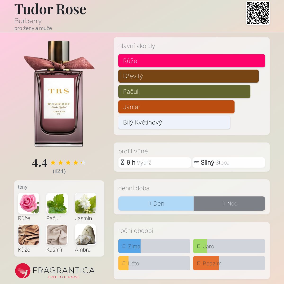 Tudor Rose podle Burberry je Chypre Floral vůně pro ženy a muže. Tudor Rose byl/a uveden/a v roce 2017. "Nosem" za touto vůní je Francis Kurkdjian. Vrchní tón je Bergamot ; střední tóny jsouDamašská růže, Květná růže, Jasmín a Broskev ; základní tóny jsou Pačuli, Kůže, Kašmír a Ambra.