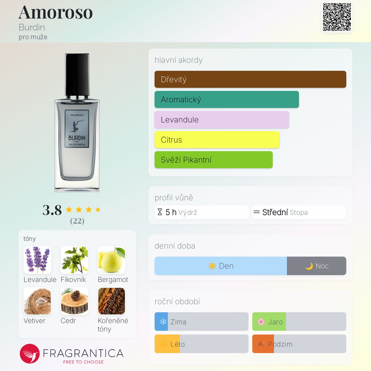 Amoroso podle Burdin je Woody Aromatic vůně pro muže. Amoroso byl/a uveden/a v roce 2021. "Nosem" za touto vůní je Nathalie Feisthauer.