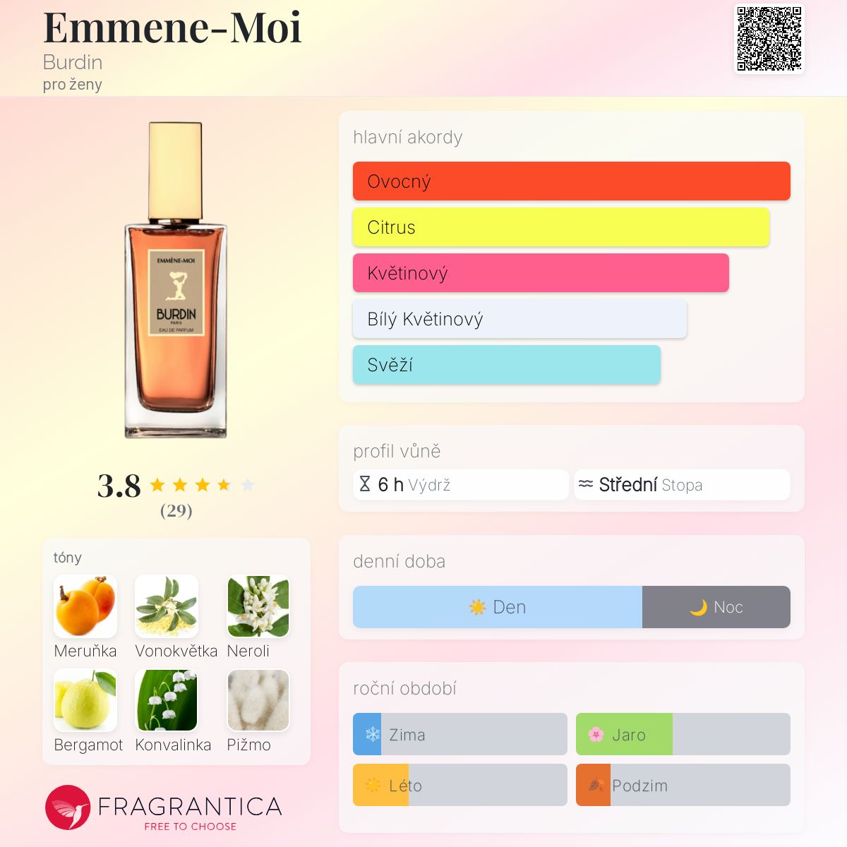 Emmene-Moi podle Burdin je Floral Fruity vůně pro ženy. Emmene-Moi byl/a uveden/a v roce 2021. "Nosem" za touto vůní je Nathalie Feisthauer. Vrchní tóny jsou Meruňka, Bergamot, Citrón a Černý pepř; střední tóny jsouVonokvětka čínská, Neroli a Konvalinka ; základní tóny jsou Pižmo a Virginský cedr.