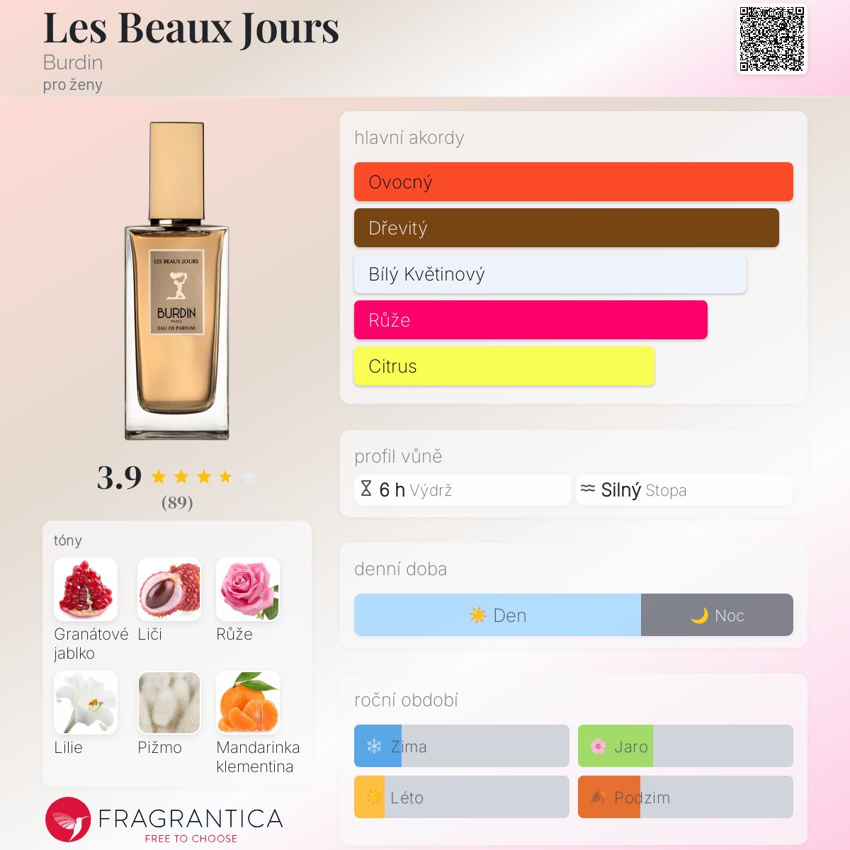Les Beaux Jours podle Burdin je Floral Fruity vůně pro ženy. Les Beaux Jours byl/a uveden/a v roce 2014. "Nosem" za touto vůní je Véronique Nyberg. Vrchní tóny jsou Granátové jablko, Liči a Mandarinka klementina; střední tóny jsouTurecká růže, Lilie a Jasmín ; základní tóny jsou Pižmo, Vetiver a Cedr.