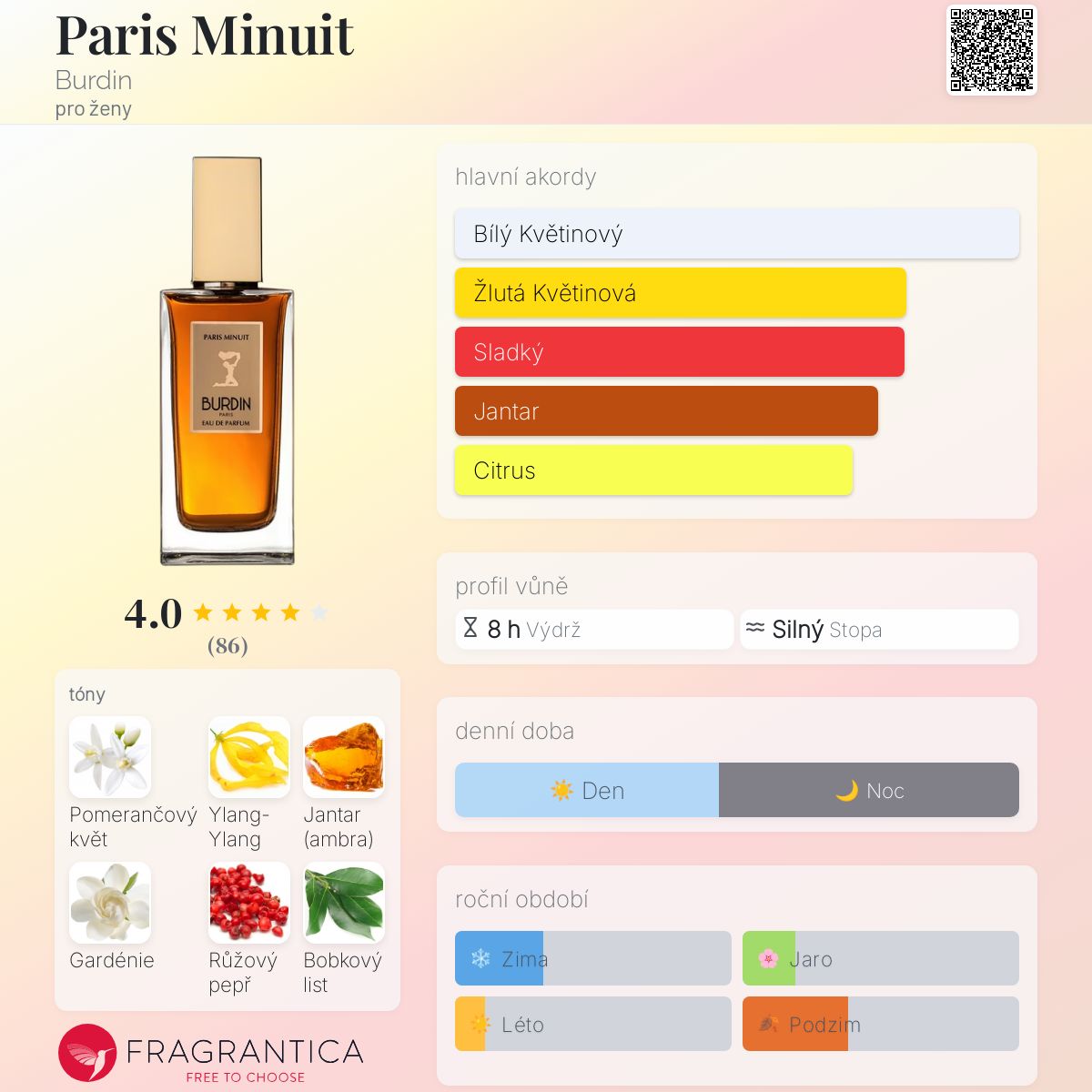 Paris Minuit podle Burdin je Chypre Floral vůně pro ženy. Paris Minuit byl/a uveden/a v roce 2014. "Nosem" za touto vůní je Véronique Nyberg. Vrchní tóny jsou Růžový pepř, Bobkový list a Mandarinka; střední tóny jsouPomerančový květ, Ylang-Ylang a Gardénie ; základní tóny jsou Jantar (ambra), Pačuli a Vanilka.
