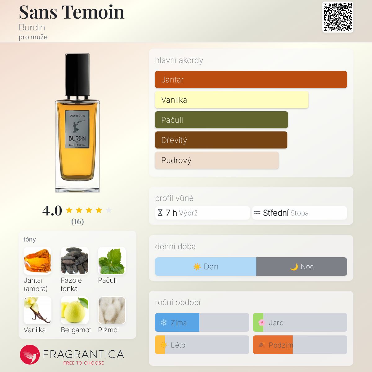 Sans Temoin podle Burdin je Orientální vůně pro muže. Sans Temoin byl/a uveden/a v roce 2021. "Nosem" za touto vůní je Nathalie Feisthauer.