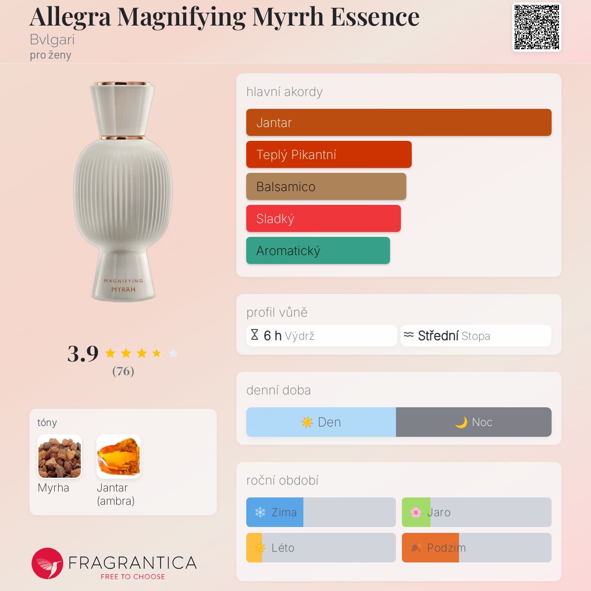 Allegra Magnifying Myrrh Essence podle Bvlgari je Orientální vůně pro ženy. Allegra Magnifying Myrrh Essence byl/a uveden/a v roce 2022. "Nosem" za touto vůní je Jacques Cavallier Belletrud.