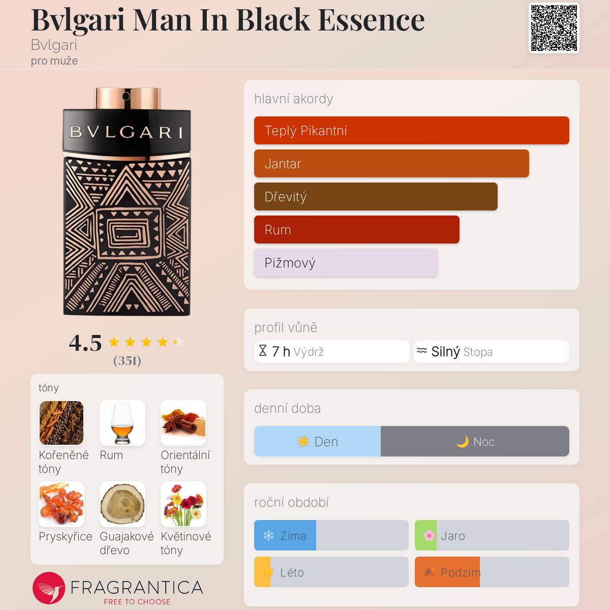 Bvlgari Man In Black Essence podle Bvlgari je Orientální Spicy vůně pro muže. Bvlgari Man In Black Essence byl/a uveden/a v roce 2017. "Nosem" za touto vůní je Alberto Morillas. Vrchní tóny jsou Koření a Rum; střední tóny jsouKvětiny a Pižmo ; základní tóny jsou Orientální tóny, Pryskyřice a Guajakové dřevo.