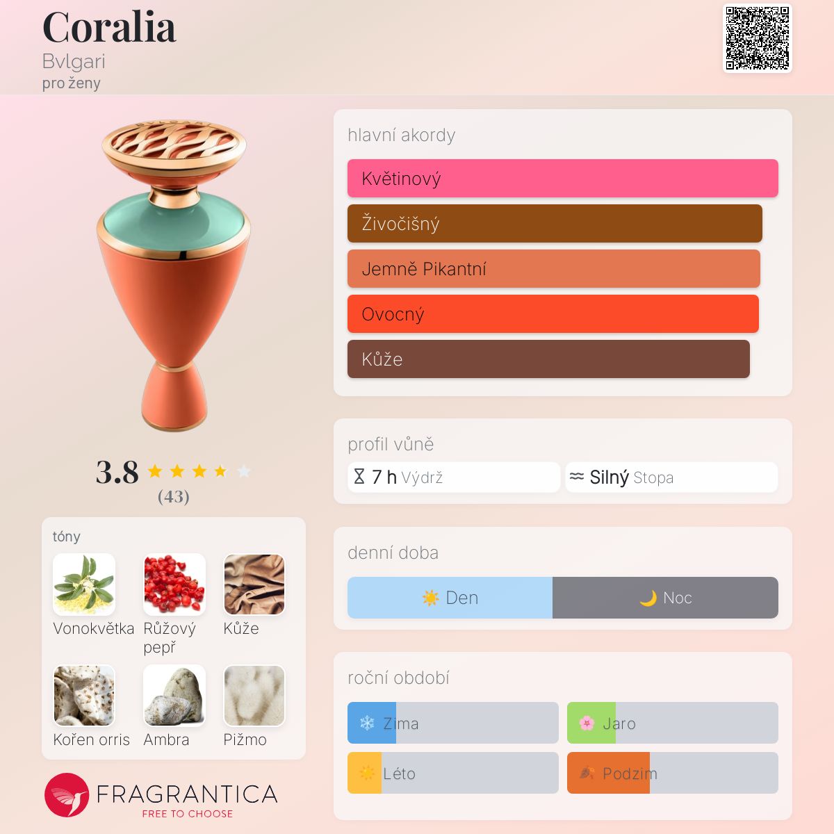 Coralia podle Bvlgari je Orientální Floral vůně pro ženy. Coralia byl/a uveden/a v roce 2019. "Nosem" za touto vůní je Sophie Labbe. Vrchní tóny jsou Růžový pepř a Mandarinka; střední tóny jsouVonokvětka, Kůže a Orris ; základní tóny jsou Ambra a Pižmo.