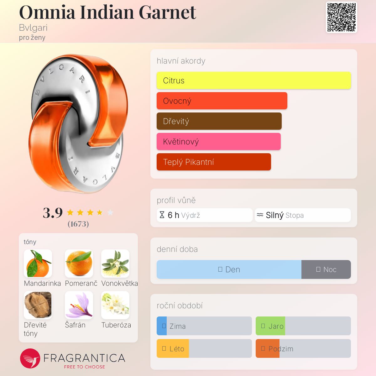 Omnia Indian Garnet podle Bvlgari je Orientální Floral vůně pro ženy. Omnia Indian Garnet byl/a uveden/a v roce 2014. "Nosem" za touto vůní je Alberto Morillas. Vrchní tóny jsou Mandarinka, Pomeranč a Indický šafrán; střední tóny jsouVonokvětka a Indická tuberóza ; základní tóny jsou Dřevité tóny a Jantar (ambra).