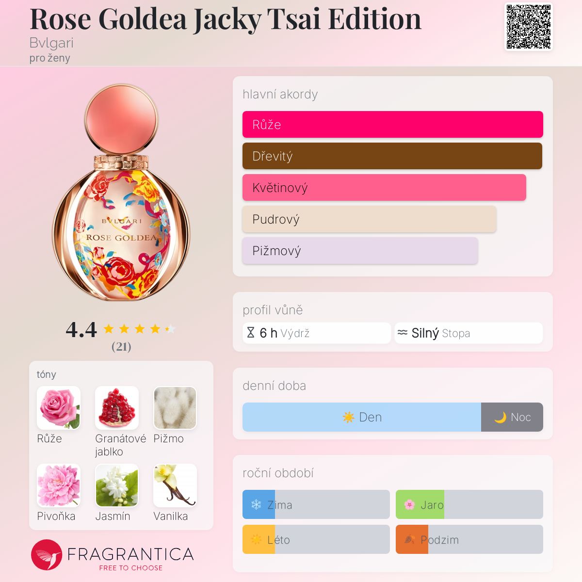 Rose Goldea Jacky Tsai Edition podle Bvlgari je Floral Woody Musk vůně pro ženy. Rose Goldea Jacky Tsai Edition byl/a uveden/a v roce 2018. "Nosem" za touto vůní je Alberto Morillas. Vrchní tóny jsou Růže, Granátové jablko, Pižmo a Bergamot; střední tóny jsouDamašská růže, Pivoňka, Jasmín a Broskev ; základní tóny jsou Pižmo, Vanilka, Santalové dřevo a Olibanum.