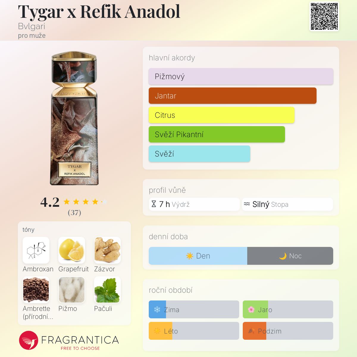 Tygar x Refik Anadol podle Bvlgari je Citrus vůně pro muže. Toto je nová vůně. Tygar x Refik Anadol byl/a uveden/a v roce 2025. "Nosem" za touto vůní je Jacques Cavallier Belletrud. Vrchní tón je Grapefruit ; střední tóny jsouZázvor a Ambrette (přírodní pižmo) ; základní tóny jsou Ambroxan, Pižmo, Pačuli a Vetiver.
