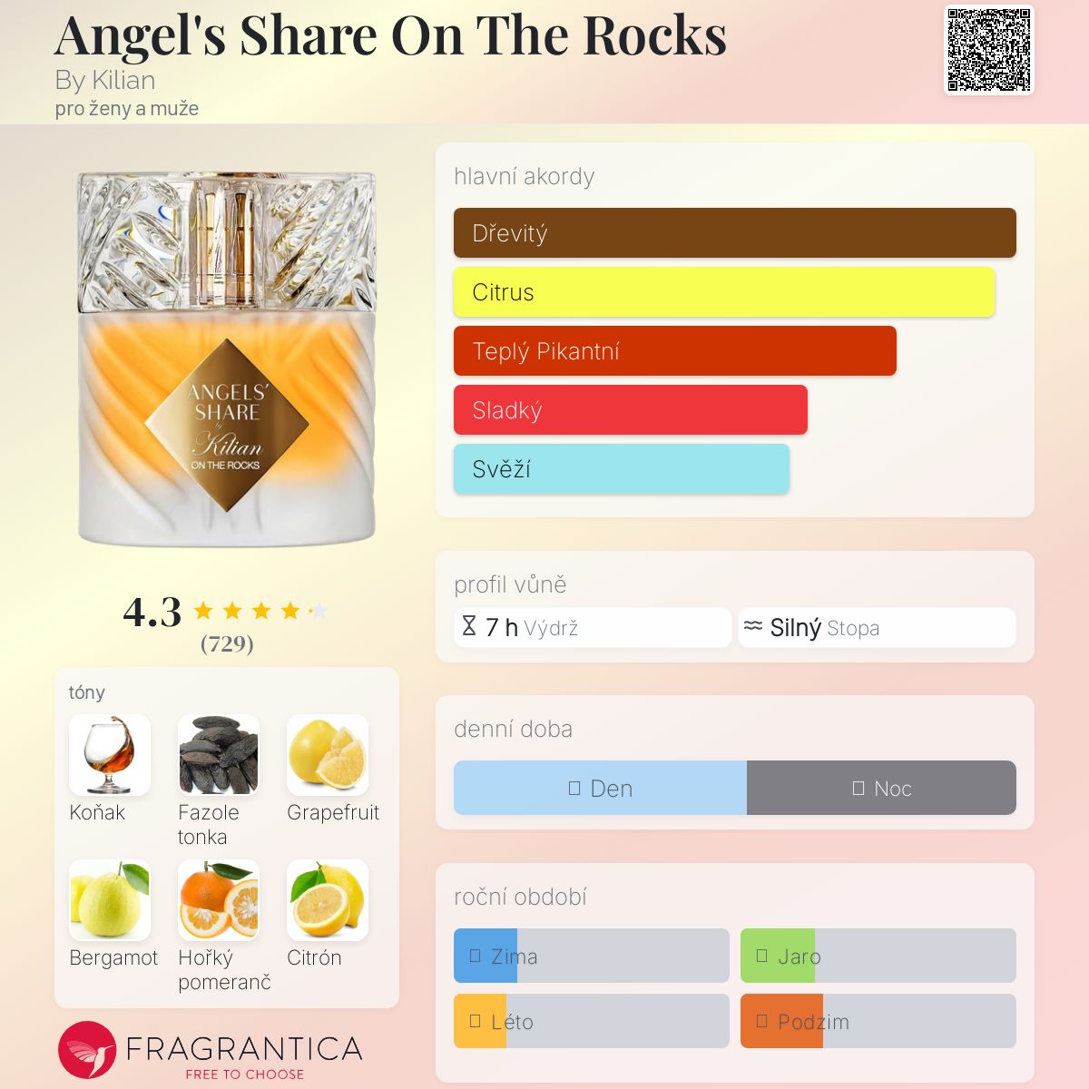 Angel's Share On The Rocks podle By Kilian je Orientální Woody vůně pro ženy a muže. Toto je nová vůně. Angel's Share On The Rocks byl/a uveden/a v roce 2025. "Nosem" za touto vůní je Benoist Lapouza. Vrchní tóny jsou Grapefruit, Bergamot, Italský citrón, Led, Hořký pomeranč, Mandarinka a Aldehydy; střední tóny jsouKoňak, Skořice a Karamel ; základní tóny jsou Fazole tonka, Dub, Santalové dřevo, Kašmírové dřevo a Myrha.