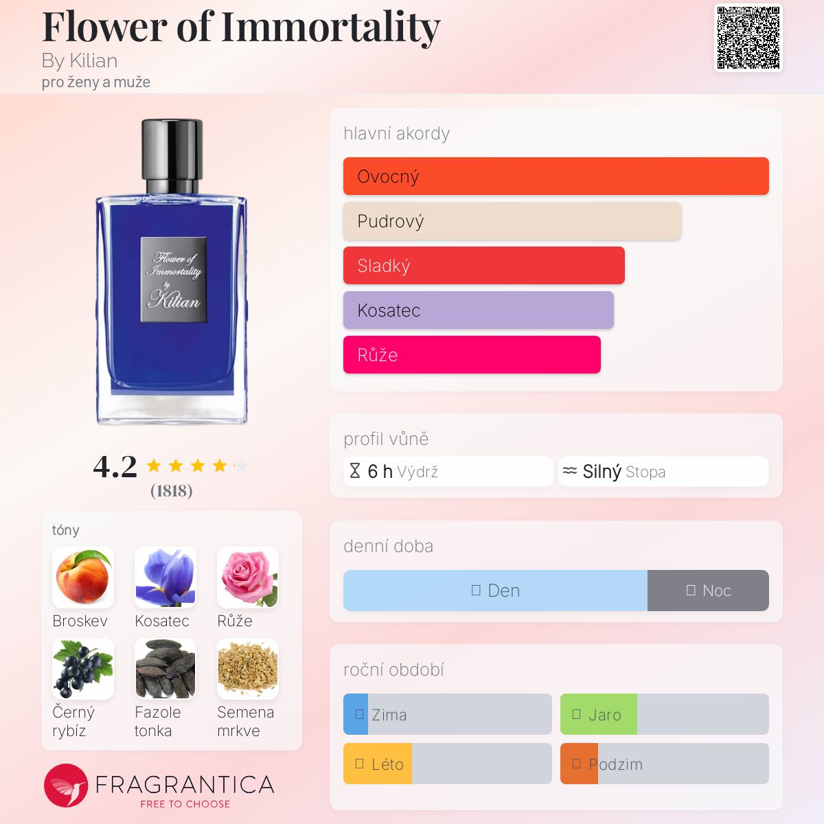 Flower of Immortality podle By Kilian je Floral Fruity vůně pro ženy a muže. Flower of Immortality byl/a uveden/a v roce 2013. "Nosem" za touto vůní je Calice Becker. Vrchní tóny jsou Bílá broskev, Nektarinka, Broskvový květ a Kokos; střední tóny jsouKosatec, Růže, Černý rybíz a Frézie ; základní tóny jsou Fazole tonka, Semena mrkve, Vanilka a Pižmo.