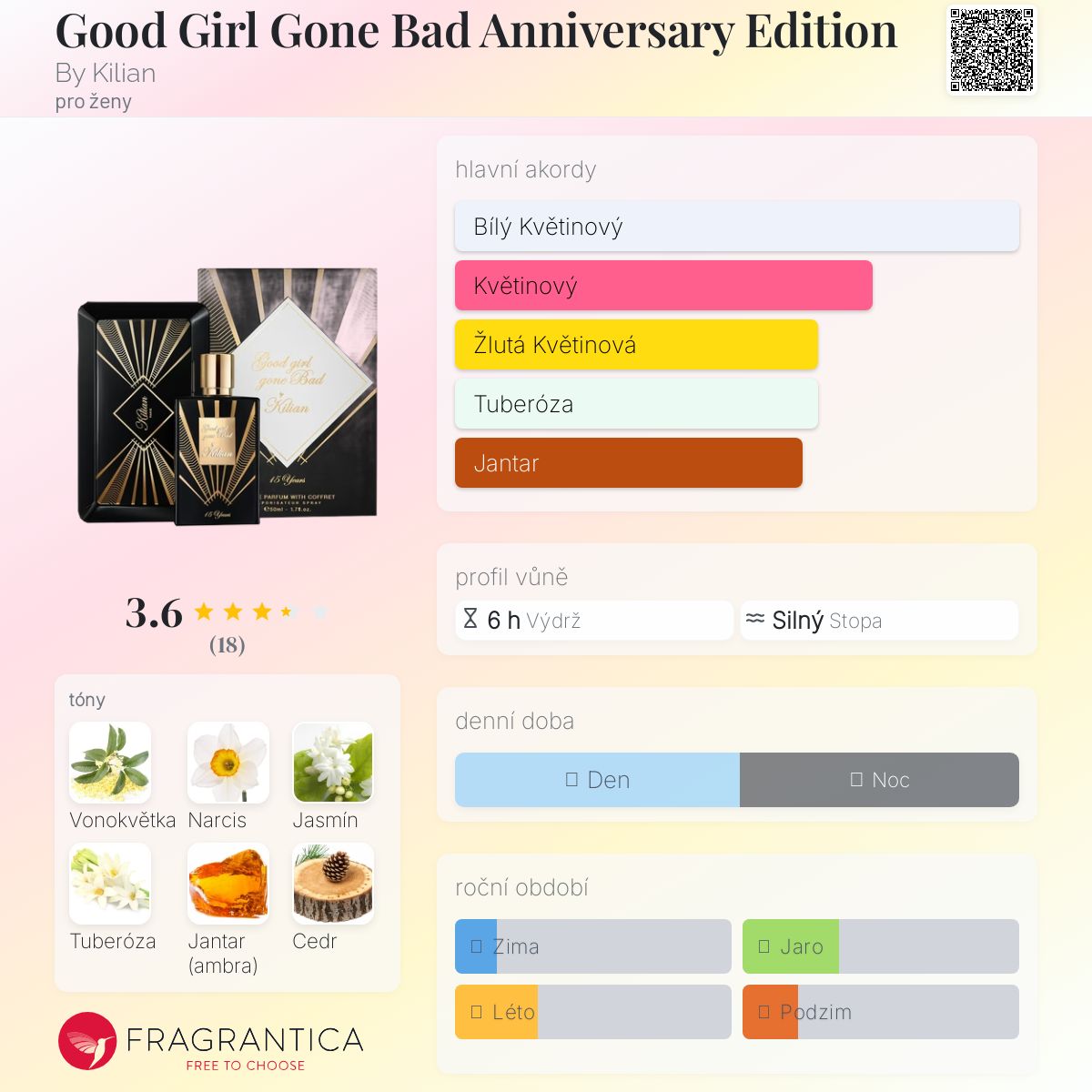 Good Girl Gone Bad Anniversary Edition podle By Kilian je Floral vůně pro ženy. Good Girl Gone Bad Anniversary Edition byl/a uveden/a v roce 2022. "Nosem" za touto vůní je Alberto Morillas. Vrchní tóny jsou Vonokvětka, Pomerančový květ a Květná růže; střední tóny jsouNarcis, Jasmín a Indická tuberóza ; základní tóny jsou Jantar (ambra) a Cedr.