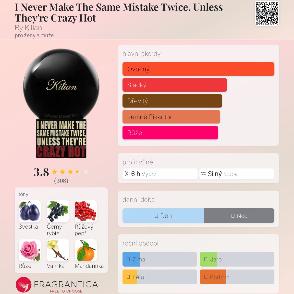 I Never Make The Same Mistake Twice, Unless They're Crazy Hot podle By Kilian je Orientální Floral vůně pro ženy a muže. I Never Make The Same Mistake Twice, Unless They're Crazy Hot byl/a uveden/a v roce 2020. "Nosem" za touto vůní je Calice Becker. Vrchní tóny jsou Černý rybíz, Růžový pepř, Mandarinka a Hruška; střední tóny jsouŠvestka, Růže a Pačuli ; základní tóny jsou Vanilka a Santalové dřevo.