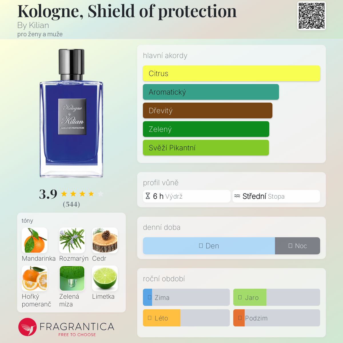 Kologne, Shield of protection podle By Kilian je Citrus Aromatic vůně pro ženy a muže. Kologne, Shield of protection byl/a uveden/a v roce 2022. "Nosem" za touto vůní je Calice Becker. Vrchní tóny jsou Zelená mandarinka, Hořký pomeranč, Limetka, Máta a Eukalyptus; střední tóny jsouRozmarýn, Petitgrain, Neroli, Zázvor a Galbanum ; základní tóny jsou Cedr, Zelená míza, Kašmírové dřevo a Pižmo.