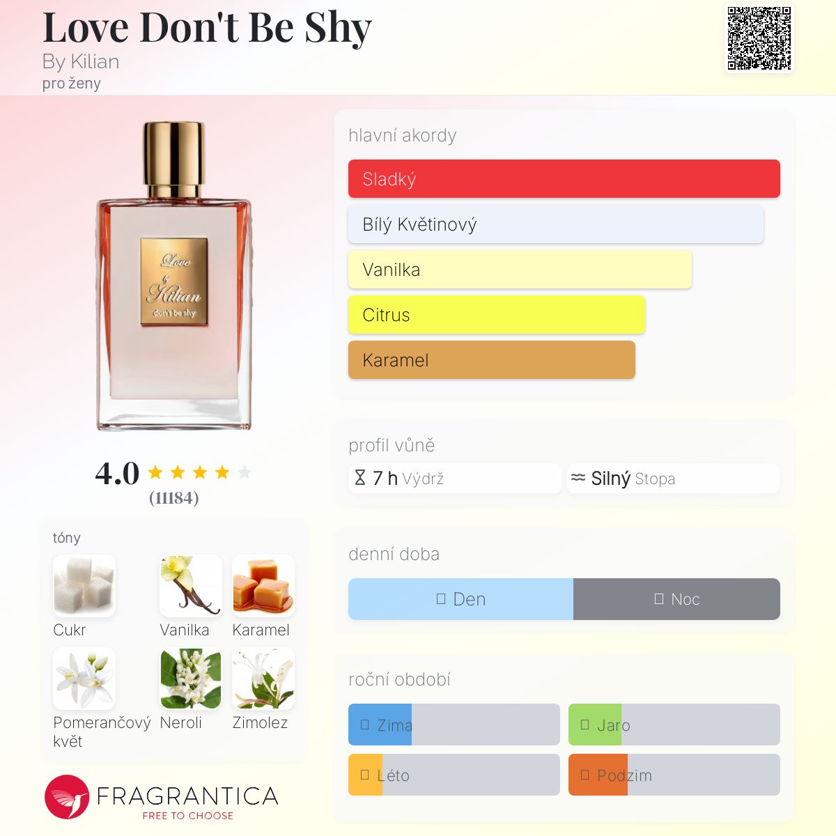 Love Don't Be Shy podle By Kilian je Orientální vůně pro ženy. Love Don't Be Shy byl/a uveden/a v roce 2007. "Nosem" za touto vůní je Calice Becker. Vrchní tóny jsou Neroli, Bergamot, Růžový pepř a Koriandr; střední tóny jsouPomerančový květ, Zimolez, Jasmín, Kosatec, Marshamallow a Růže ; základní tóny jsou Cukr, Vanilka, Karamel, Pižmo, Cibetka a Labdanum.