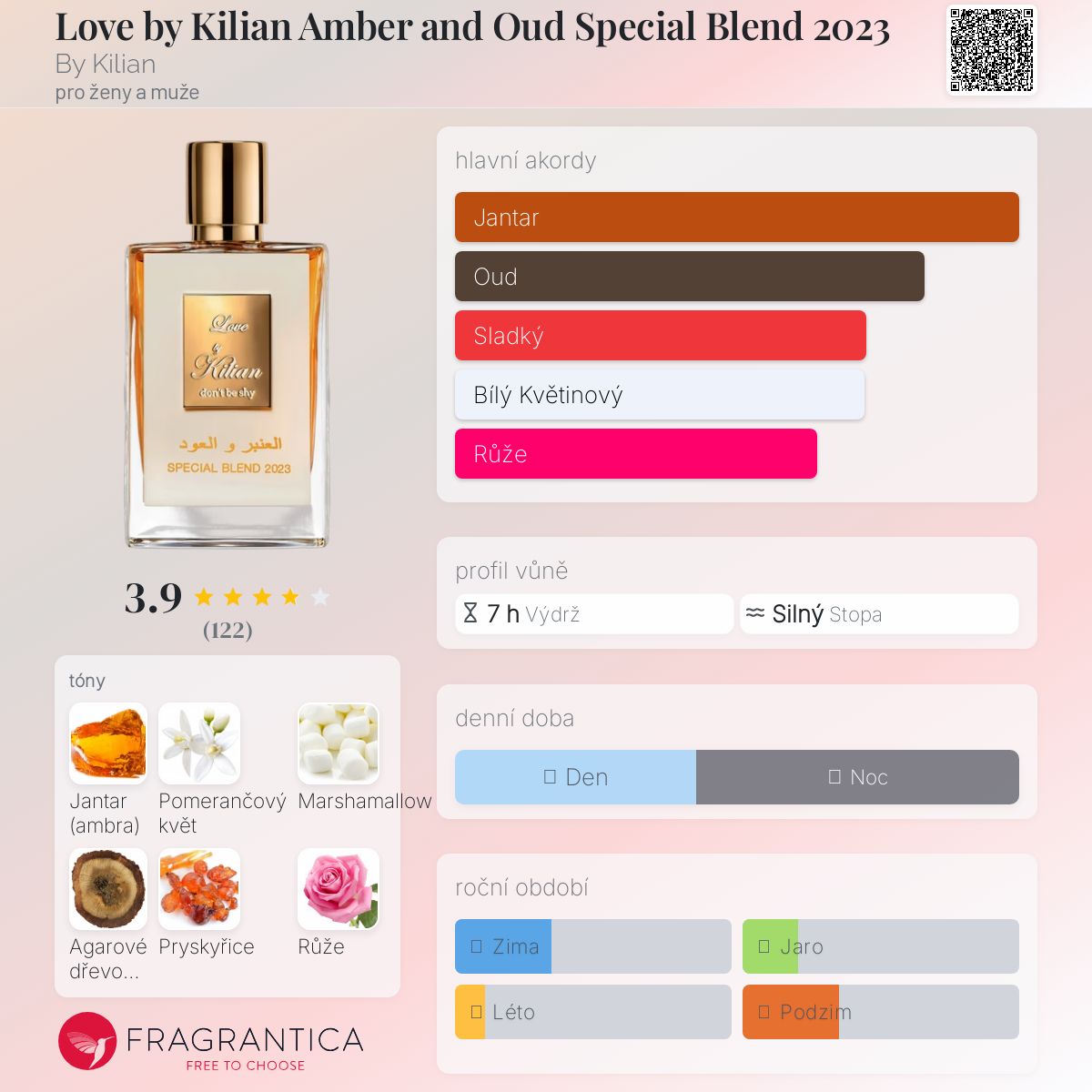 Love by Kilian Amber and Oud Special Blend 2023 podle By Kilian je Orientální Woody vůně pro ženy a muže. Love by Kilian Amber and Oud Special Blend 2023 byl/a uveden/a v roce 2023. "Nosem" za touto vůní je Calice Becker. Vrchní tóny jsou Tuniský pomerančový květ, Marshamallow a Bulharská růže; střední tóny jsouJantar (ambra), Pryskyřice a Koření ; základní tóny jsou Jantar (ambra), Agarové dřevo (oud) a Dřevo akigala.