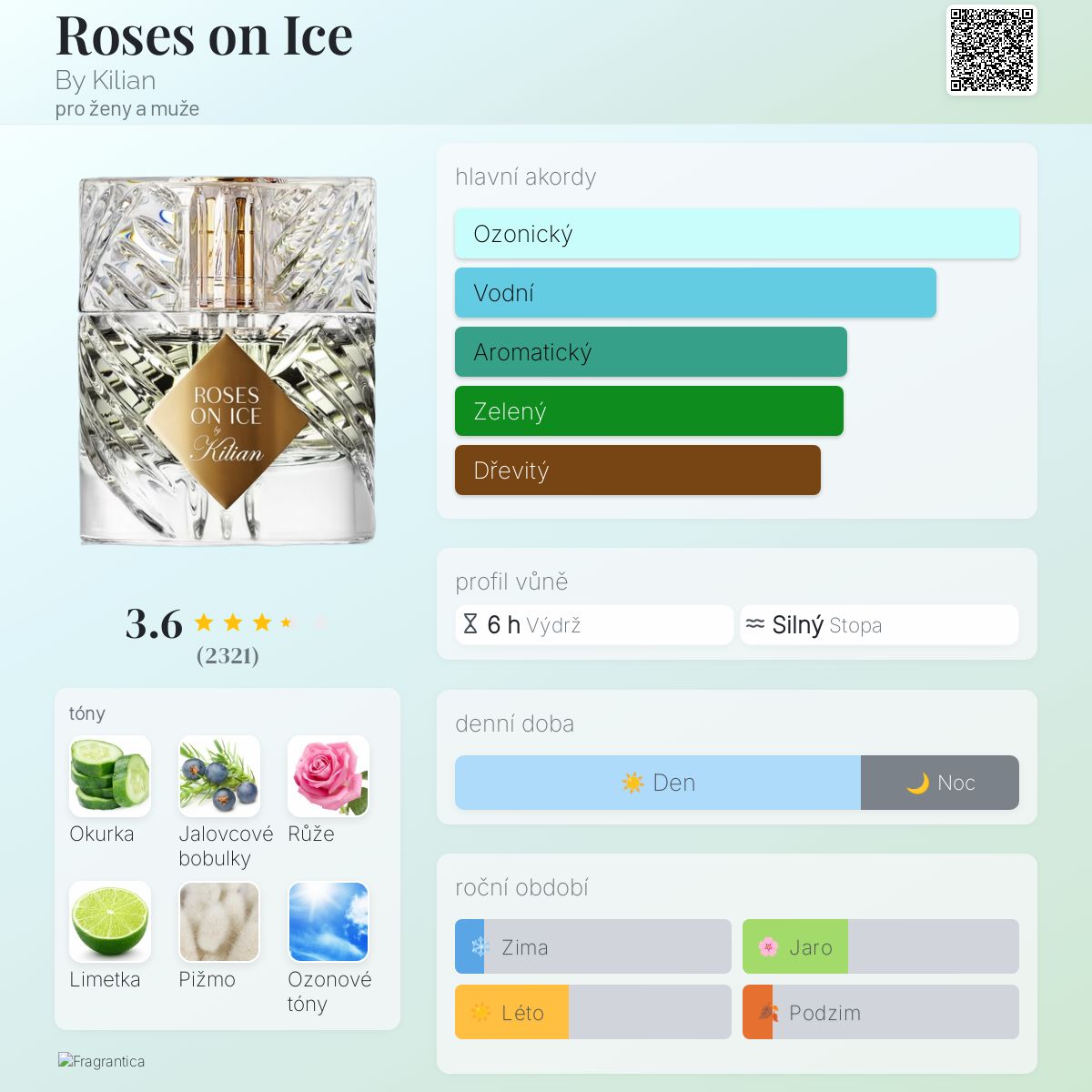 Byla jsem zvědavá, jak bude tento parfém vonět, vzhledem ke všem článkům a recenzím, které jsem o něm četla a které byly nepříznivé. Obecně mám vůně Kilian ráda. Tato vůně se mi líbí a jsem ráda, že ji mám ve své sbírce, i když to není žádná láska. Co se mi na ní líbí? Je studená, svěží a osvěžující. Myslím, že růže na ledu je pro ni vynikající název. Voní jako osvěžující nápoj, který je lehce bylinkový. Růže je v lehké květinové verzi a hraje vedlejší roli. Okurka je rozhodně dominantní. Opravdu vydrží vonět celý den. Mé oblíbené vůně jsou teplé gurmánské, následované bílými květinami, což je důvod, proč by se tato vůně nedostala do mé top desítky. Ale nosit ji budu a myslím, že se povedla. Nemyslím si, že by to okolí nějak uráželo.