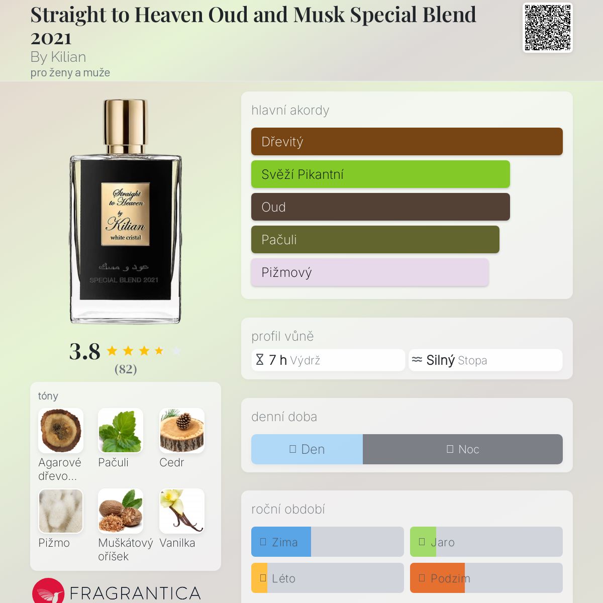 Straight to Heaven Oud and Musk Special Blend 2021 podle By Kilian je Orientální Woody vůně pro ženy a muže. Straight to Heaven Oud and Musk Special Blend 2021 byl/a uveden/a v roce 2021. "Nosem" za touto vůní je Sidonie Lancesseur. Vrchní tón je Muškátový oříšek ; střední tóny jsouPačuli, Cedr a Vanilka ; základní tóny jsou Agarové dřevo (oud) a Bílé pižmo.