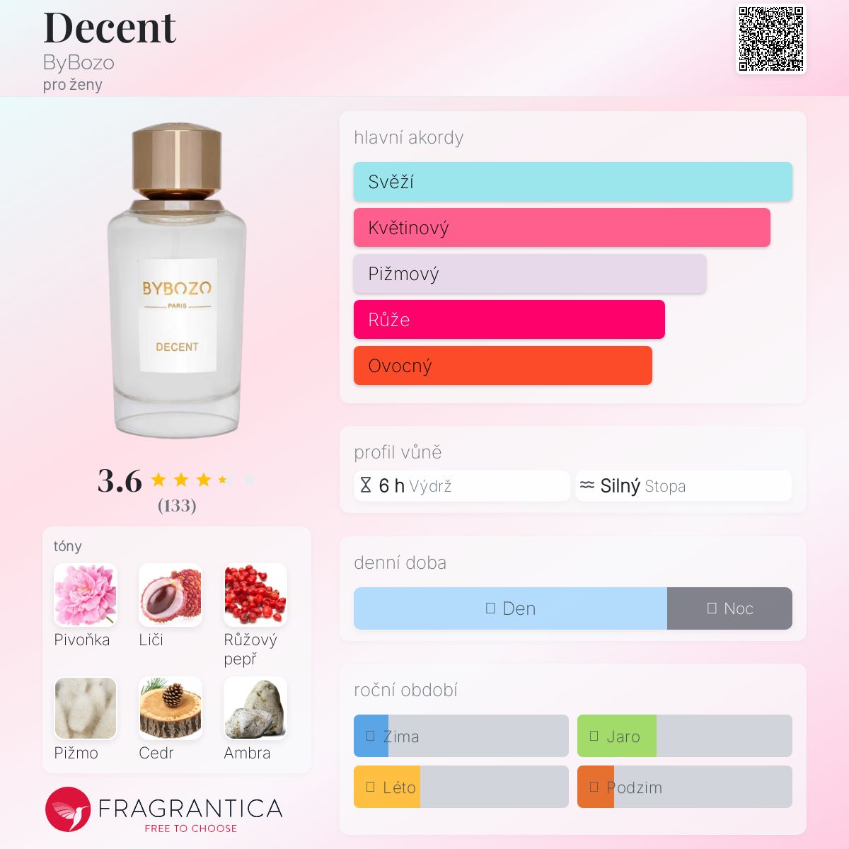 Decent podle ByBozo je Floral Woody Musk vůně pro ženy. Decent byl/a uveden/a v roce 2021. "Nosem" za touto vůní je Paul Emilien. Vrchní tón je Růžový pepř ; střední tóny jsouPivoňka a Liči ; základní tóny jsou Pižmo, Cedr a Ambra.