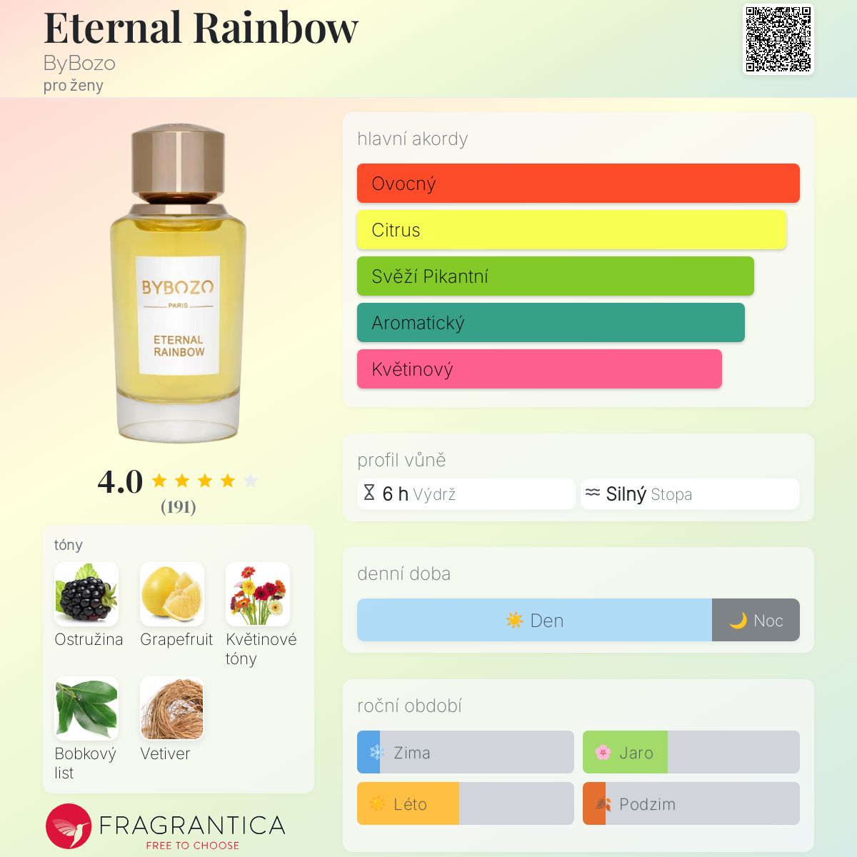 Eternal Rainbow podle ByBozo je Floral Fruity vůně pro ženy. Eternal Rainbow byl/a uveden/a v roce 2021. "Nosem" za touto vůní je Paul Emilien. základní tóny jsou Ostružina, Grapefruit, Květinové tóny, Vavříny a Vetiver.